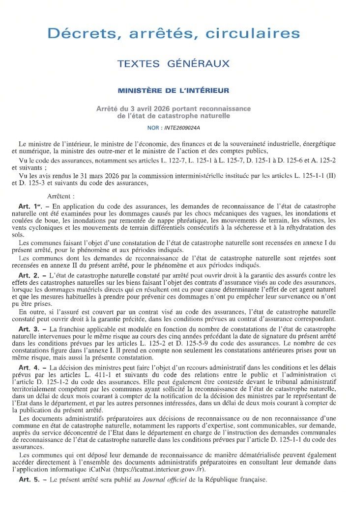 L’arrêté portant reconnaissance de l’état de catastrophe naturelle pour la commune de Saint-Louis-de-Montferrand a été publié en date du 14 avril 2026.
