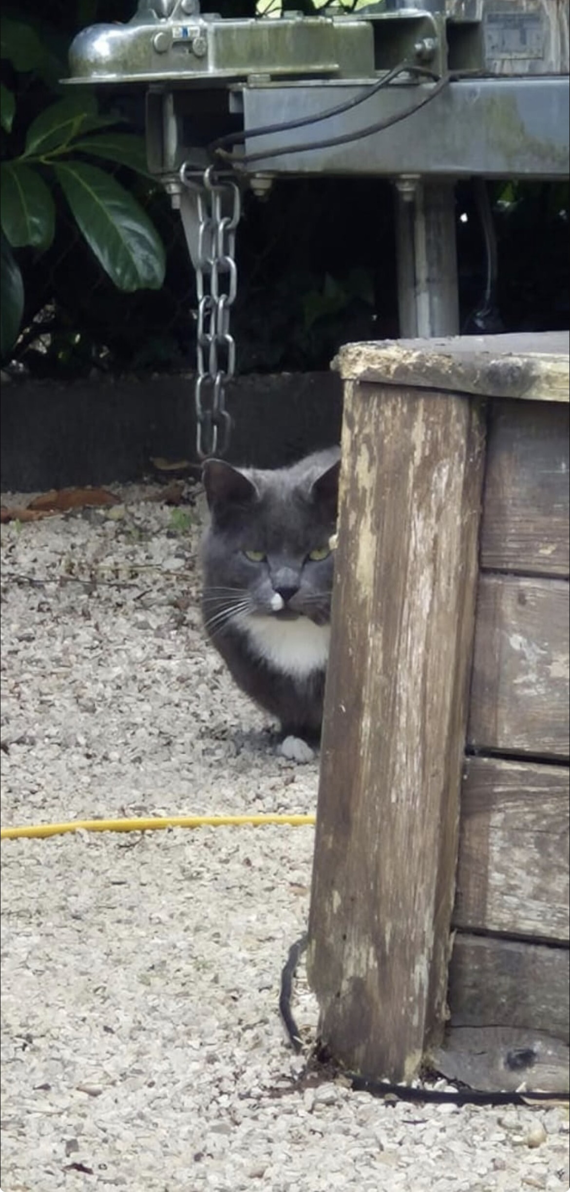 Un chat gris, plutôt peureux, apparaît régulièrement