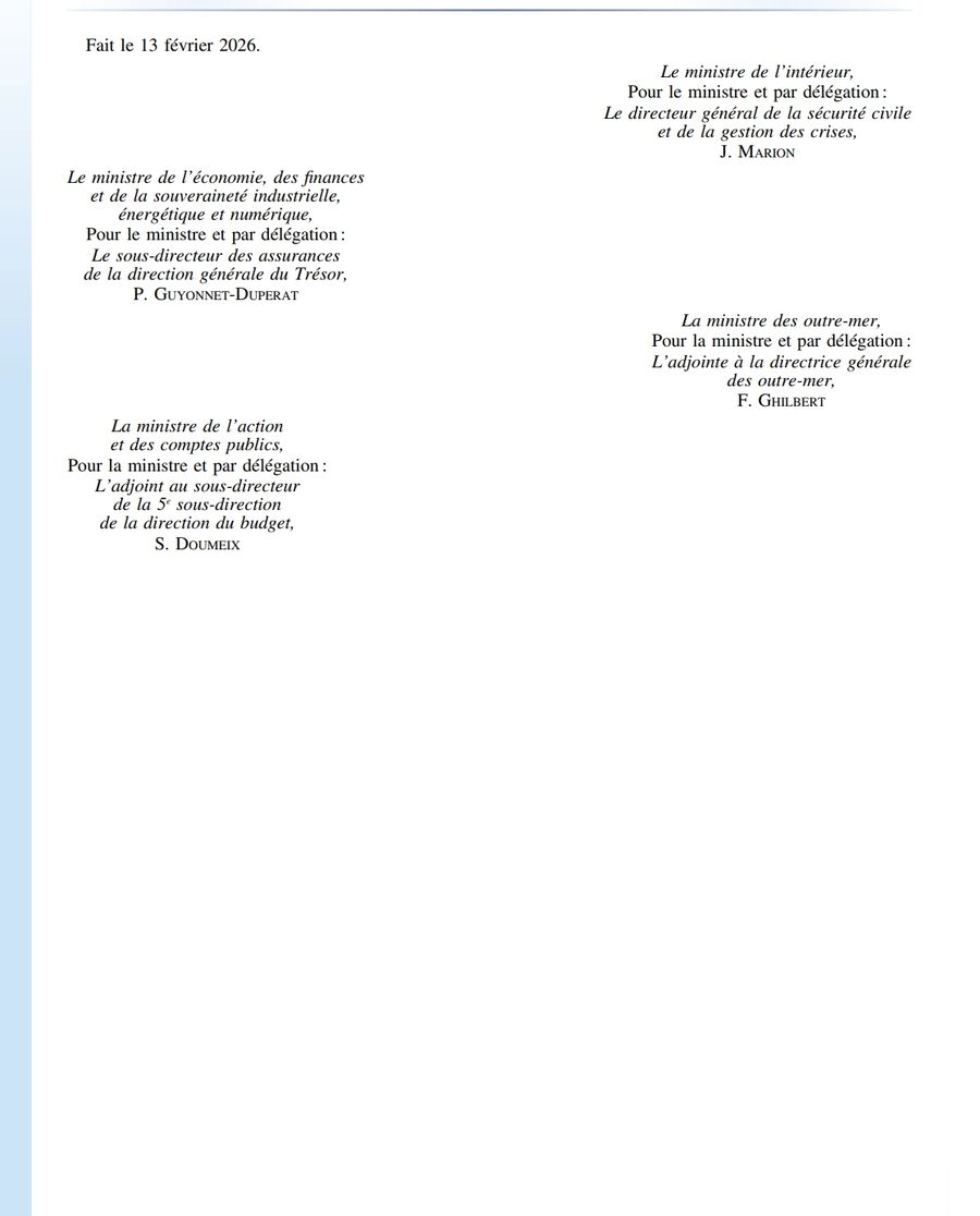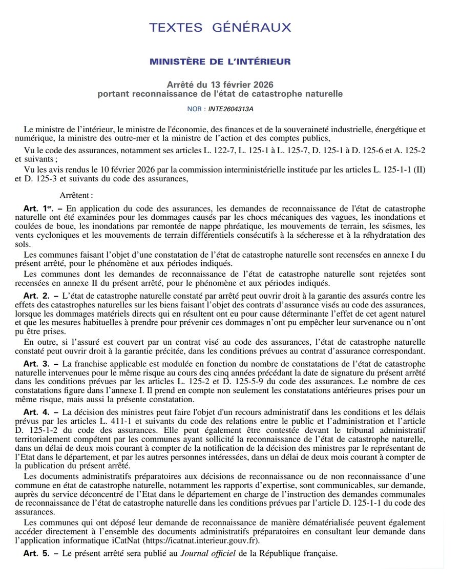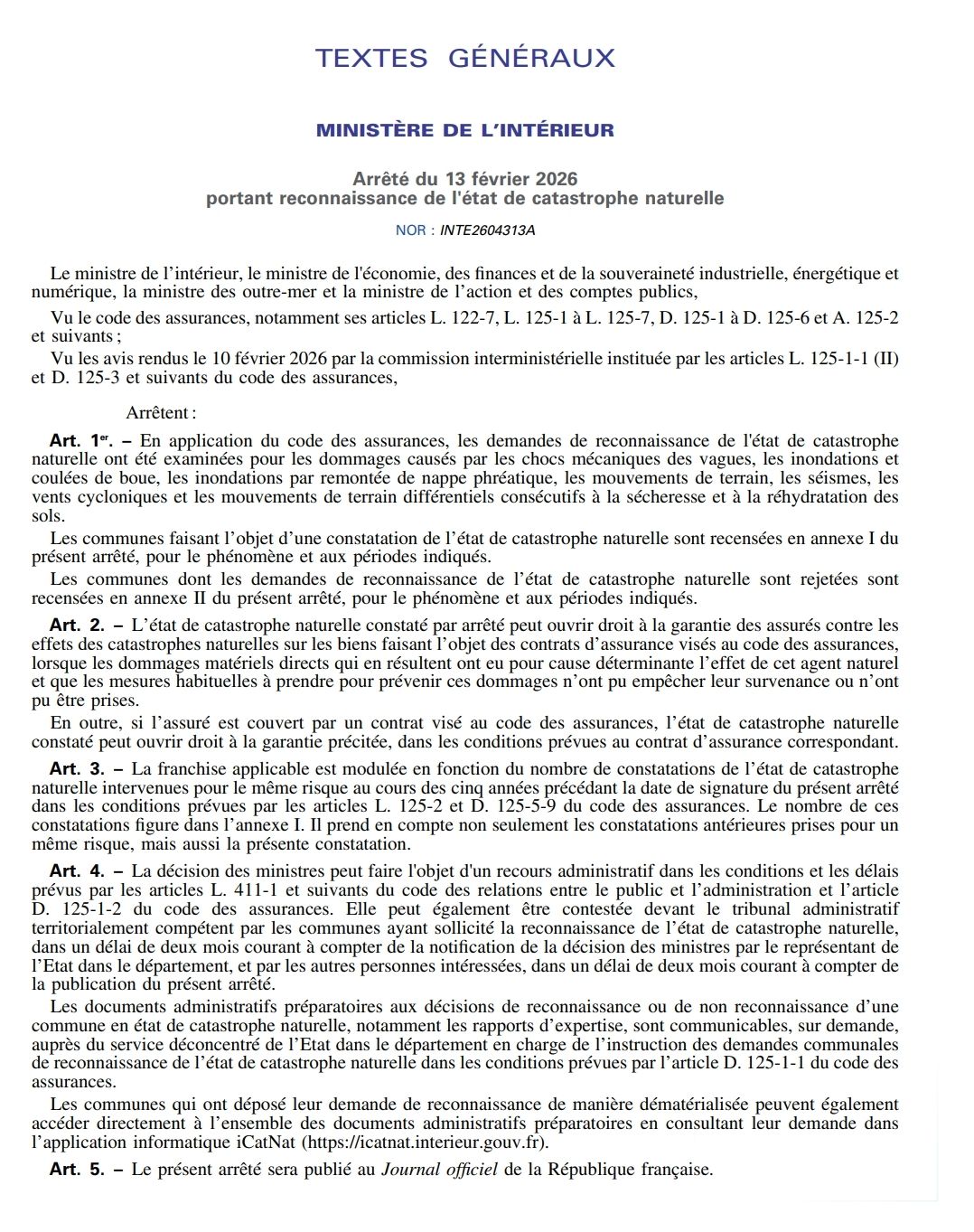 ArrĂȘtĂ© du 13 fĂ©vrier 2026 portant reconnaissance de l'Ă©tat de catastrophe naturelle
