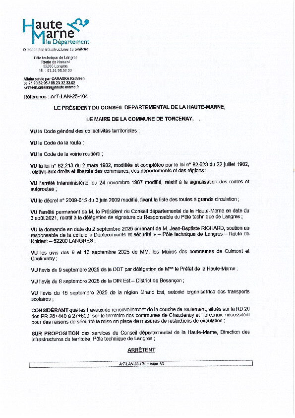 Vous trouverez ci-dessous l'arrêté réglementant la circulation lors des travaux de renouvellement de la couche de roulement sur la RD26.