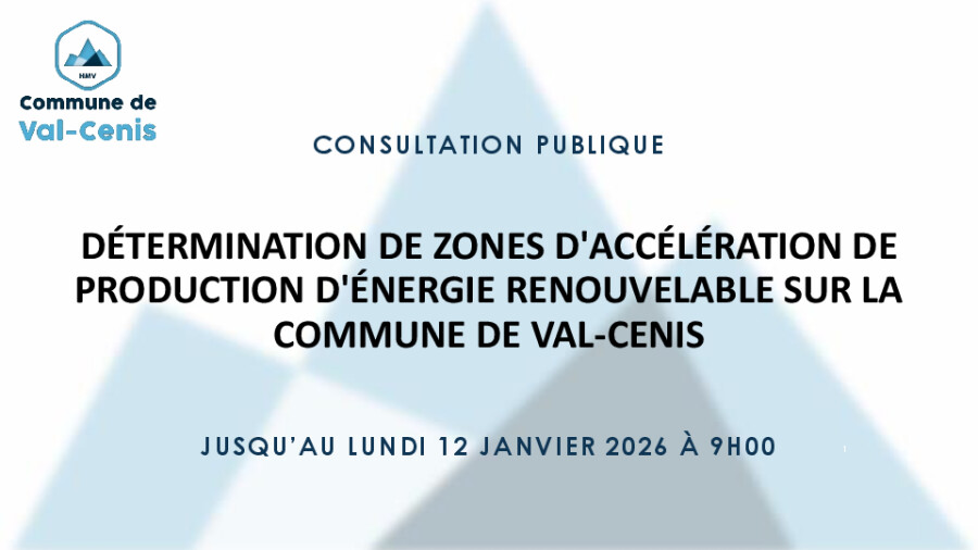 Une information également disponible sur le site internet de la commune à https://www.commune-valcenis.fr/consultation-n2-sur-la-determination-de-zones-dacceleration-de-la-production-denergie-renouvelable-sur-la-commune-de-val-cenis/
