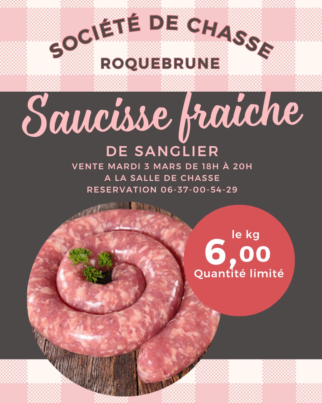 La société de chasse de Roquebrune propose à la vente, ce mardi 3 mars, de 18h à 20h, à la salle de chasse (salle des fêtes), ou sur réservation, de la saucisse fraîche de sanglier.
