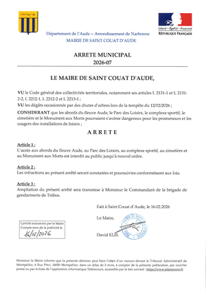 En raison des circonstances actuelles, toutes les manifestations sportives, culturelles, fêtes, spectacles, ainsi que les activités de loisirs et animations locales se déroulant en extérieur sont interdites sur l'arrondissement de Narbonne, jeudi 19 février 2026 entre 12h et 22H.