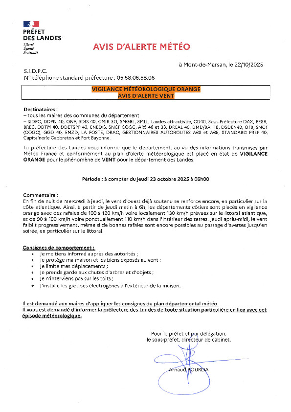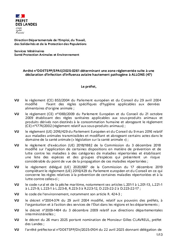 Suite à un foyer clinique 'd'influenza aviaire hautement pathogène confirmé sur la Commune d'ALLONS, une zone réglementée est mise en place impactant 4 communes des Landes en ZONE SURVEILLANCE, il s'agit de BOURRIOT-BERGONCE, LOSSE, LUBBON, MAILLAS.