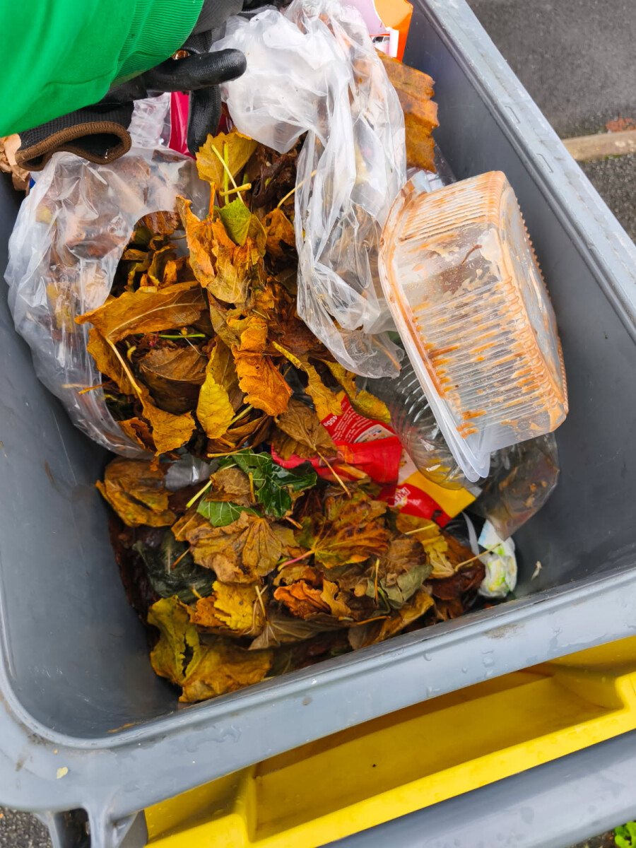 Hier matin, Hameau des Tilleuls, ils ont découvert une grosse quantité de feuilles d'arbres dissimulées dans un bac jaune en dessous des emballages triés (voir photo).
