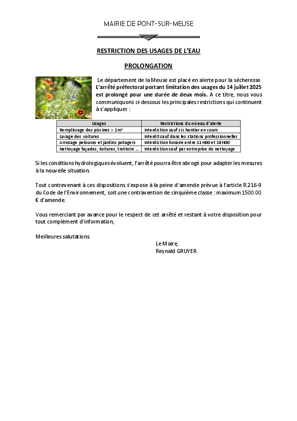 Nous vous informons que l'arrêté préfectoral du 19 août 2025 relatif aux restrictions des usages de l'eau est abrogé.