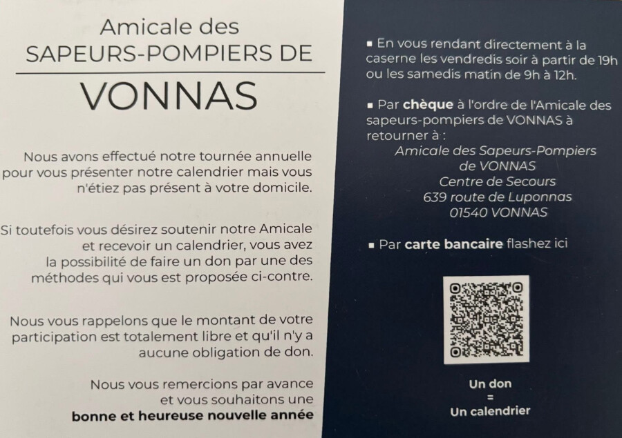 Si vous n’êtes pas présent le jour de leur venue mais que vous souhaitez quand même faire un don, un avis de passage sera déposé dans votre boîte aux lettres et vous pourrez effectuer un don en ligne via le QR code. Le calendrier vous sera ensuite déposé quelques jours plus tard.