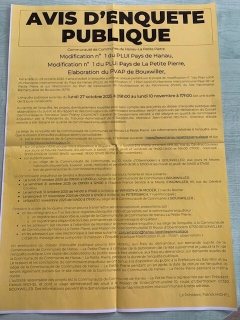 Les informations relatives à l'enquête ainsi que le dossier d'enquête publique sont consultables sur le site internet de la Communauté de Commune à l'adresse : https://www.hanau-lapetitepierre.alsace