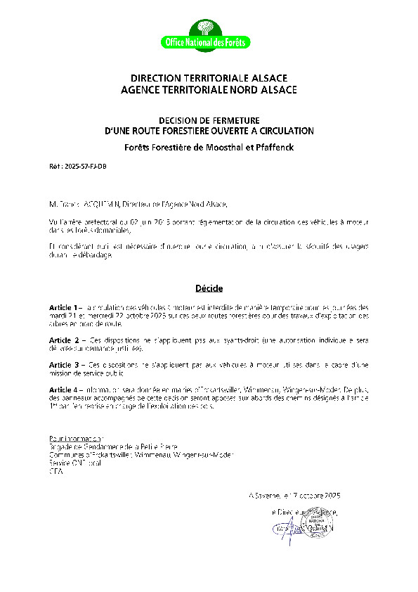 Dans le cadre de travaux forestiers, la route forestière du Moosthal sera fermée à la circulation les mardi 21 et mercredi 22 octobre 2025.