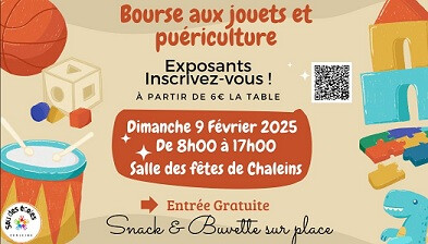 Inscription obligatoire via le lien hello asso : https://www.helloasso.com/associations/sou-des-ecoles-laiques-de-chaleins/evenements/bourses-aux-jouets-et-puericulture-novembre-2025