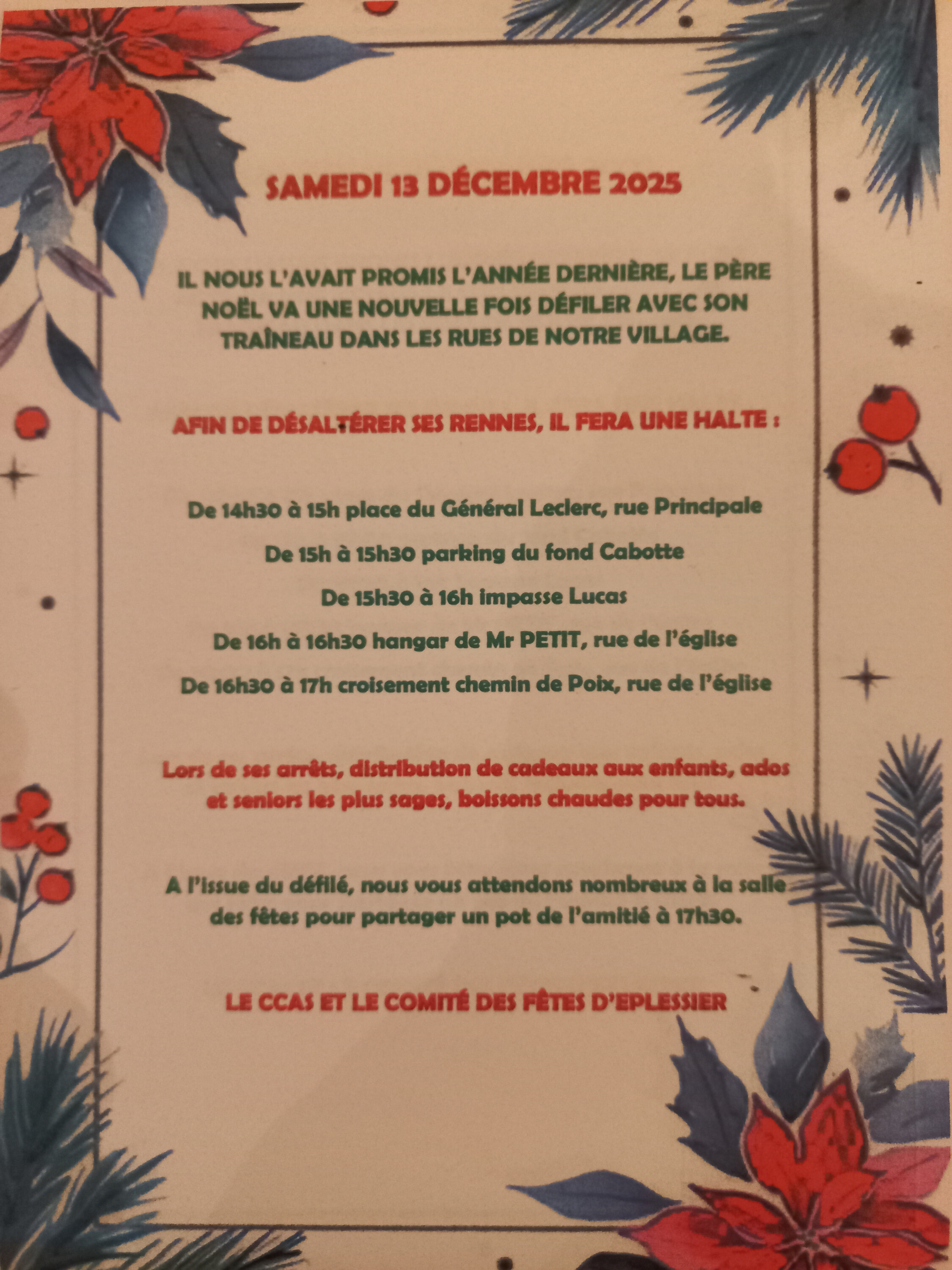 Le Comité des fêtes et le CCAS d'Éplessier vous informent que le char du Père Noël défile et s'arrête dans le village