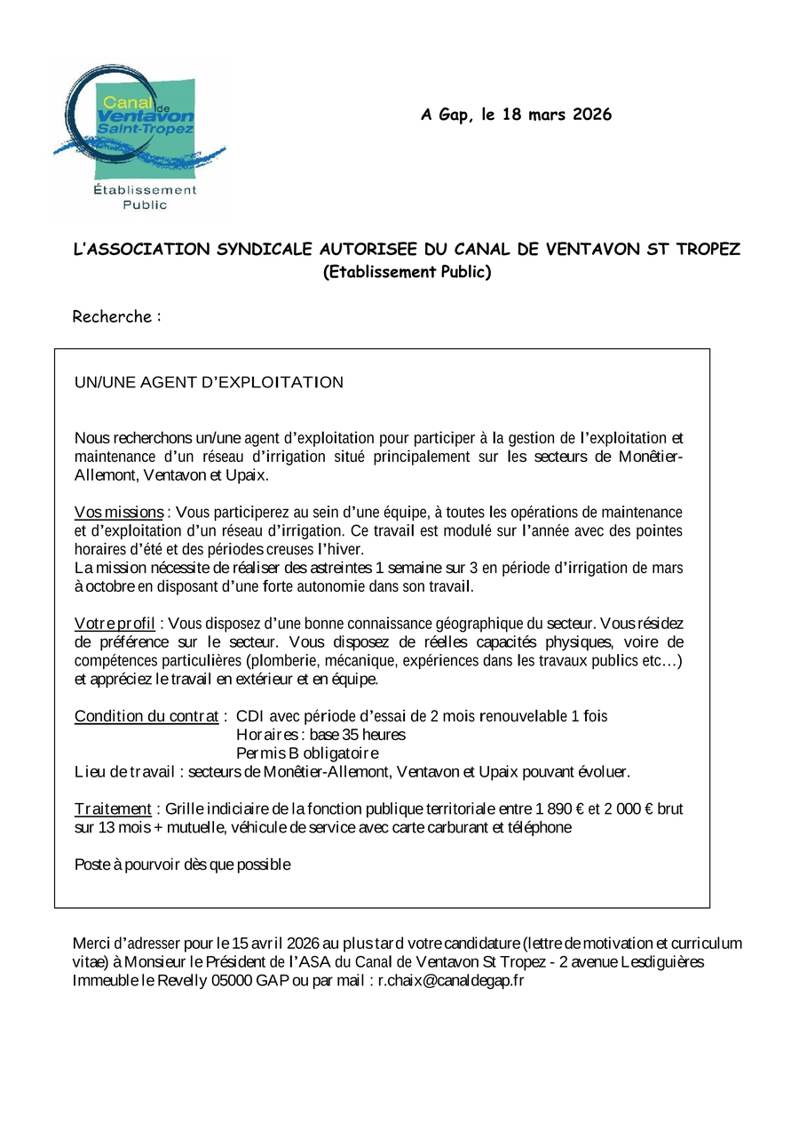 Pour ce faire, l’ASA déposera un recours devant le TA de Marseille, car nous défendrons devant le juge, que la Loi du 29/08/1919 nous a accordé un droit de prélèvement ET dans le canal domanial de Ventavon ET dans le canal EDF.