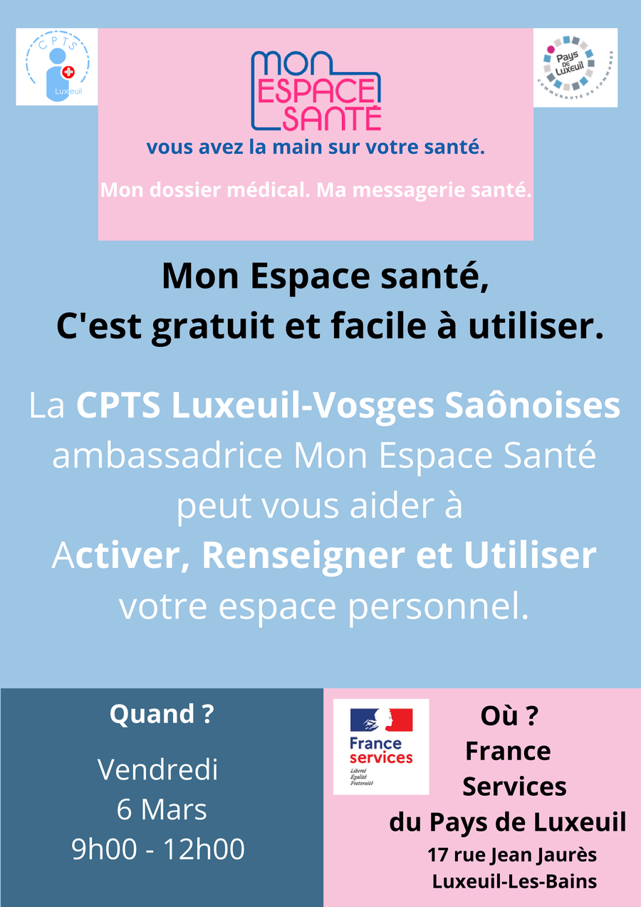 La CPTS sera présente au sein de la France Services du Pays de Luxeuil, pour vous accompagner dans la création et la prise en main de l’application mobile Mon Espace Santé.
