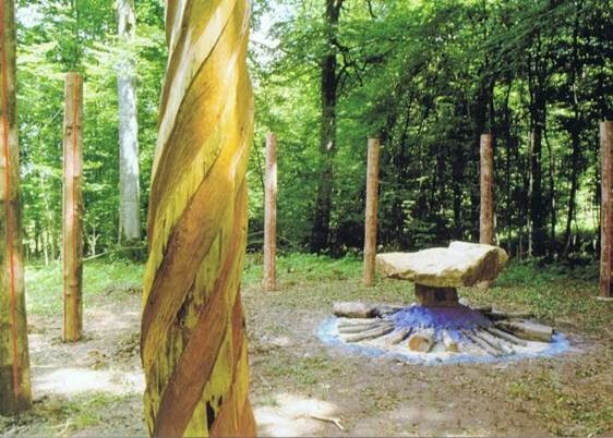 Nicolas Chenard édifie dans une clairière un sanctuaire archaïque reprenant les codes de la mythologie : il fait dialoguer un âtre central formant un autel, bleu comme un œil, avec douze troncs sculptés disposés autour en cercle. Un espace de cérémonie ou de rite est ainsi révélé. Dans les profondeurs de la forêt ressurgissent le souvenir de cultes primitifs et la ferveur de célébrations païennes qui permettent la communion avec les éléments, le Ciel et la Terre