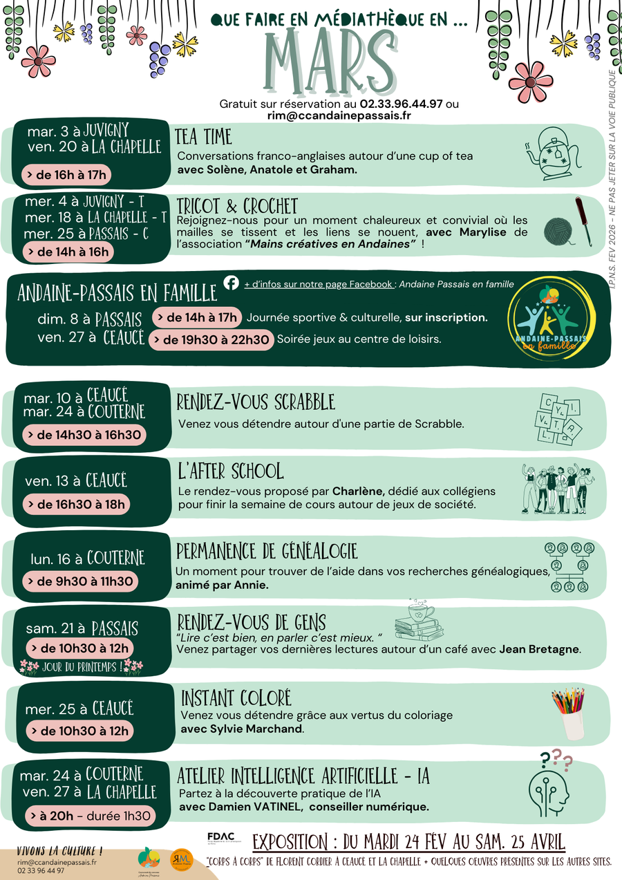 Réservations : 02.33.38.88.20 (CC Andaine-Passais) ou 02.33.38.56.66 (Maison des Associations Domfront en Poiraie)