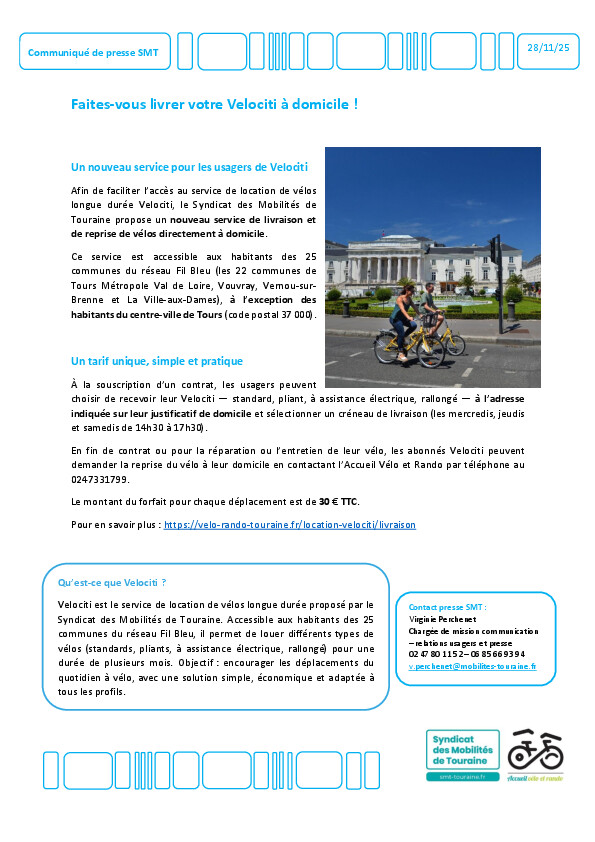Dans le cadre du développement du service Velociti, proposé par le Syndicat des Mobilités de Touraine, un nouveau service de livraison et de reprise de vélos à domicile est désormais disponible pour vos habitants.