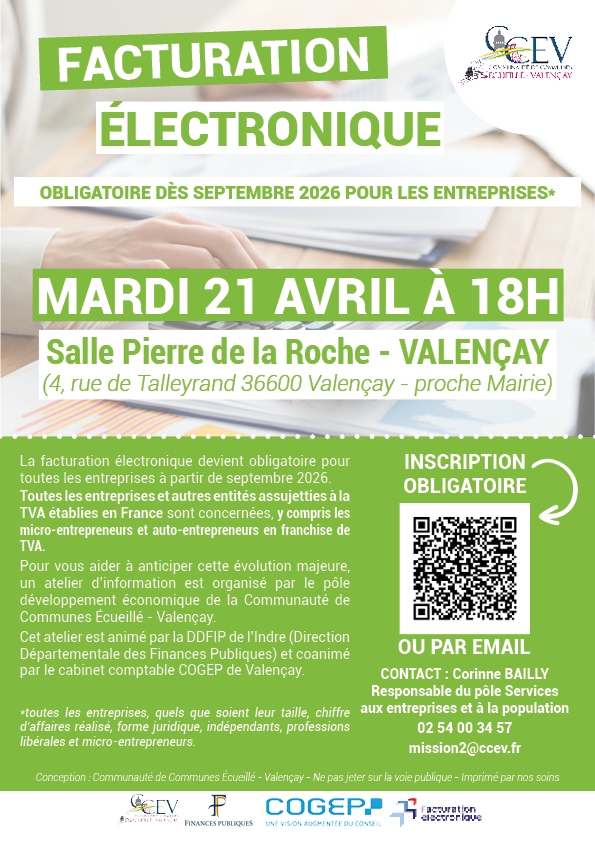 Cette réunion d'informations sera animée par la Direction Départementale des Finances Publiques de l'Indre et coanimée par le cabinet comptable COGEP de Valençay, le Mardi 21 avril à 18h, Salle Pierre de la Roche, 4 rue de Talleyrand, 36600 Valençay (proche Mairie)