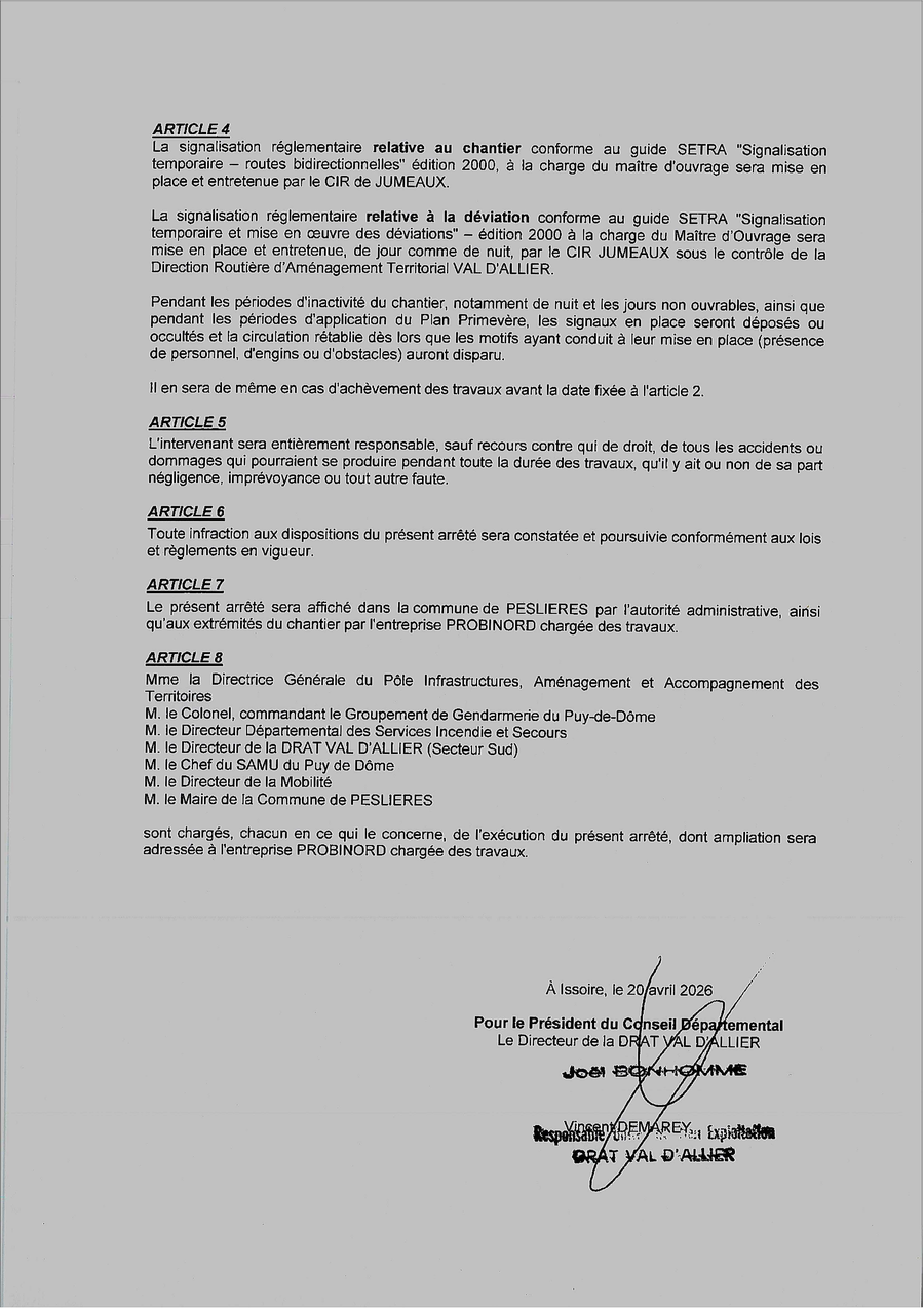 Pour permettre la réalisation de la couche de roulement en MBCF sur la RD33, par l'entreprise Probinord pour le compte du Conseil Départemental (maître d'ouvrage), la circulation de tous les véhicules sera interdite sur la RD33 entre les PR6+743 et PR8+500 sur le territoire de la commune de Peslières (63580).