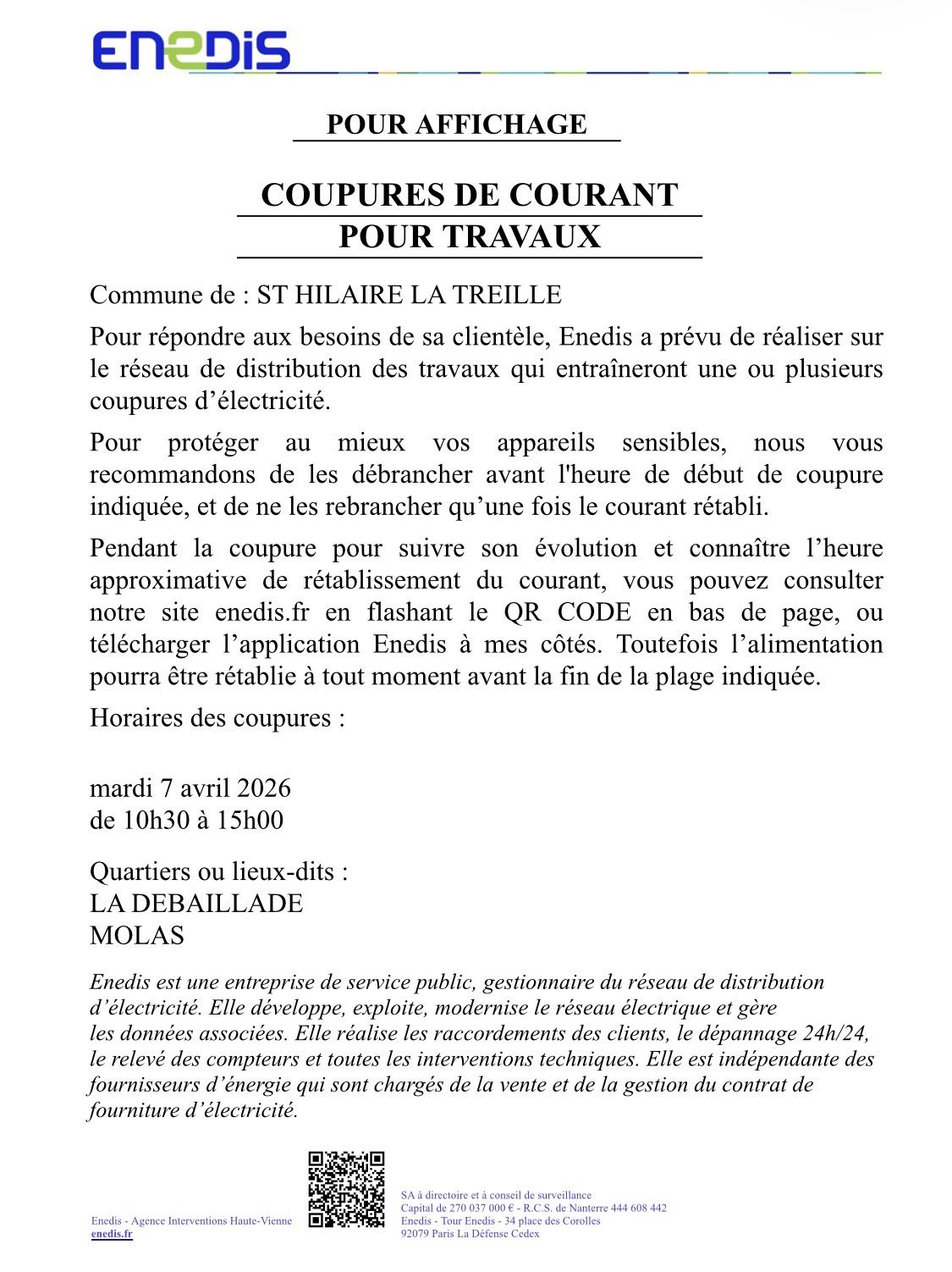 La mairie de Saint-Hilaire-la-Treille vous informe que des coupures de courant auront lieu aux lieux-dits La Debaillade et Molas le 7 mardi avril de 10:30 à 15:00.
