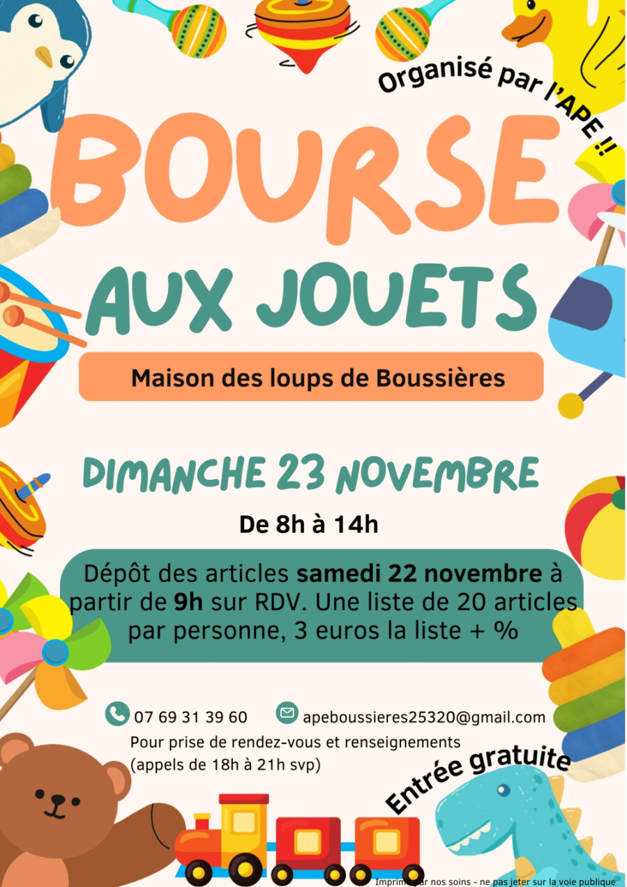 📣 La, désormais Traditionnelle, BOURSE AUX JOUETS de l'Association des Parents D'Elèves aura lieu le weekend du 22/23 novembre à Boussières ! 🎉