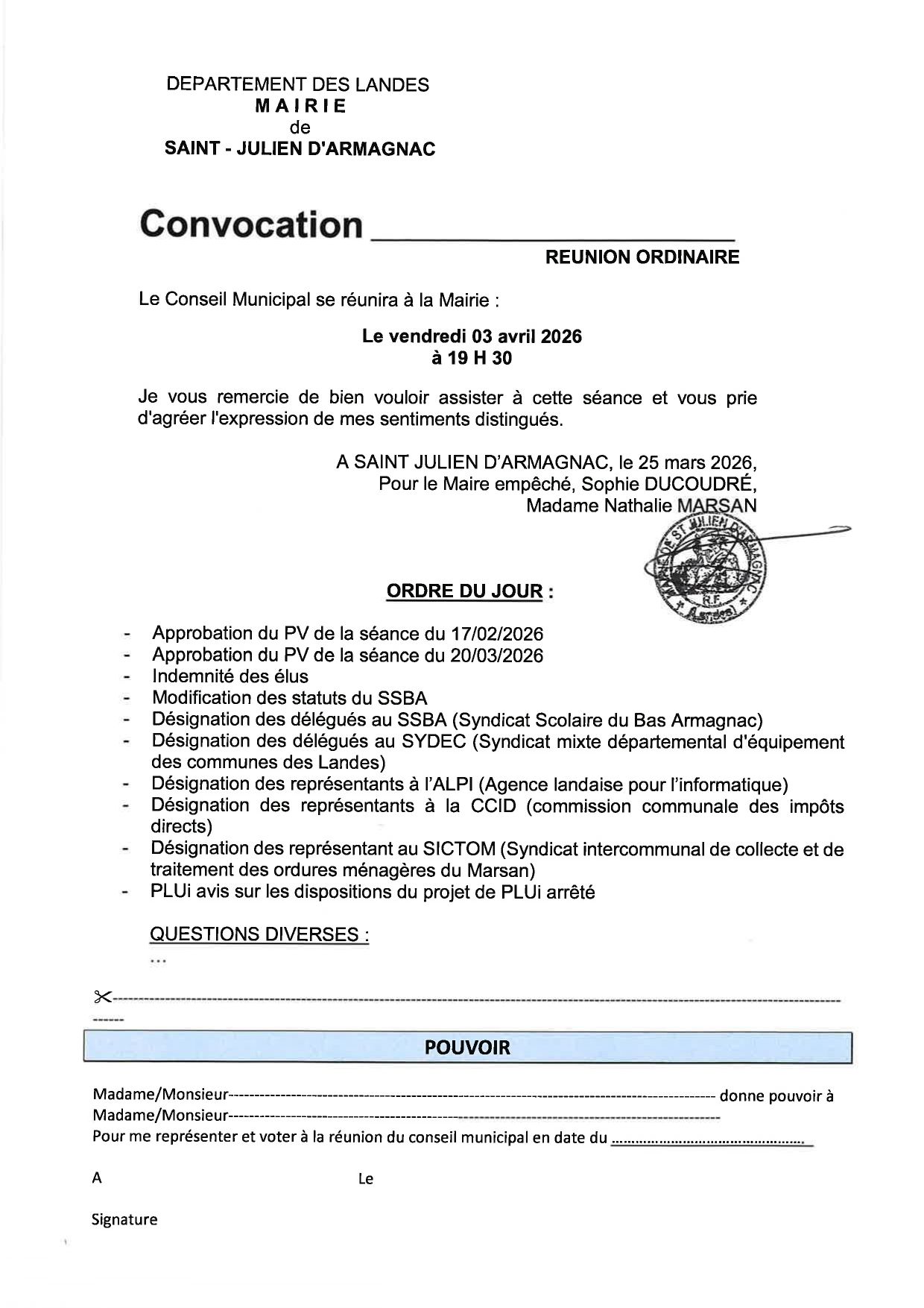 Vendredi 03 avril 2026 à 19h30 à la Mairie.