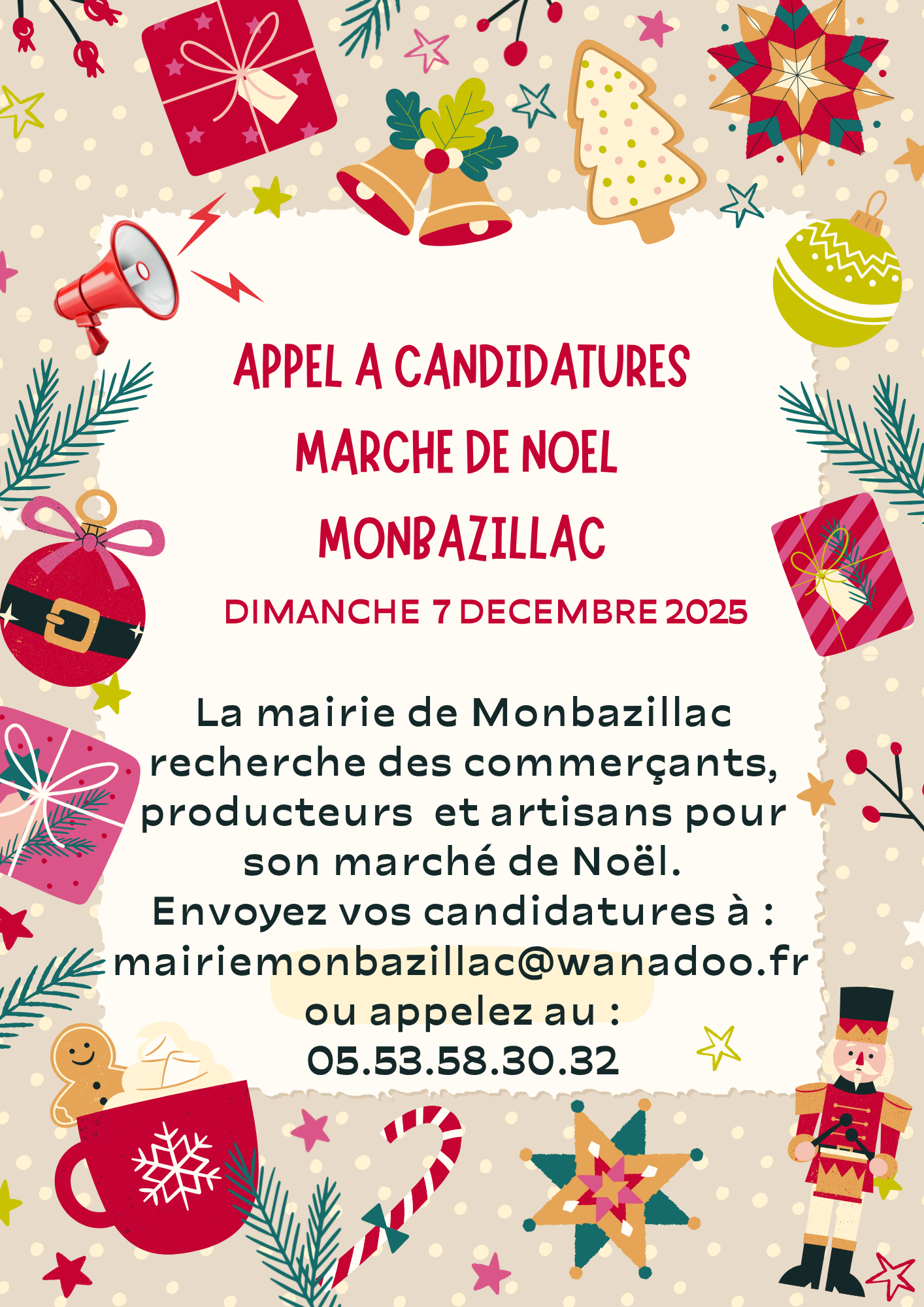 La mairie de Monbazillac organise son traditionnel marché de Noël le 7 décembre 25, toute la journée, sous la Halle du Marché.