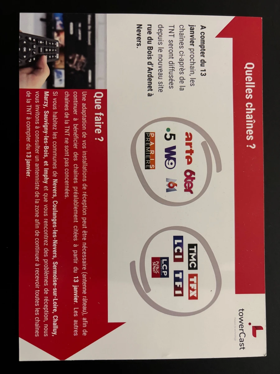 🚨En effet, à compter du 13 janvier prochain, les chaînes de la TNT : Arte, 6 Ter, France 5, W9, M6, Paris Première, TMC, TFX, LCI, TF1 et LCP, seront diffusées depuis le nouveau site rue du Bois d'Ardenet à Nevers.