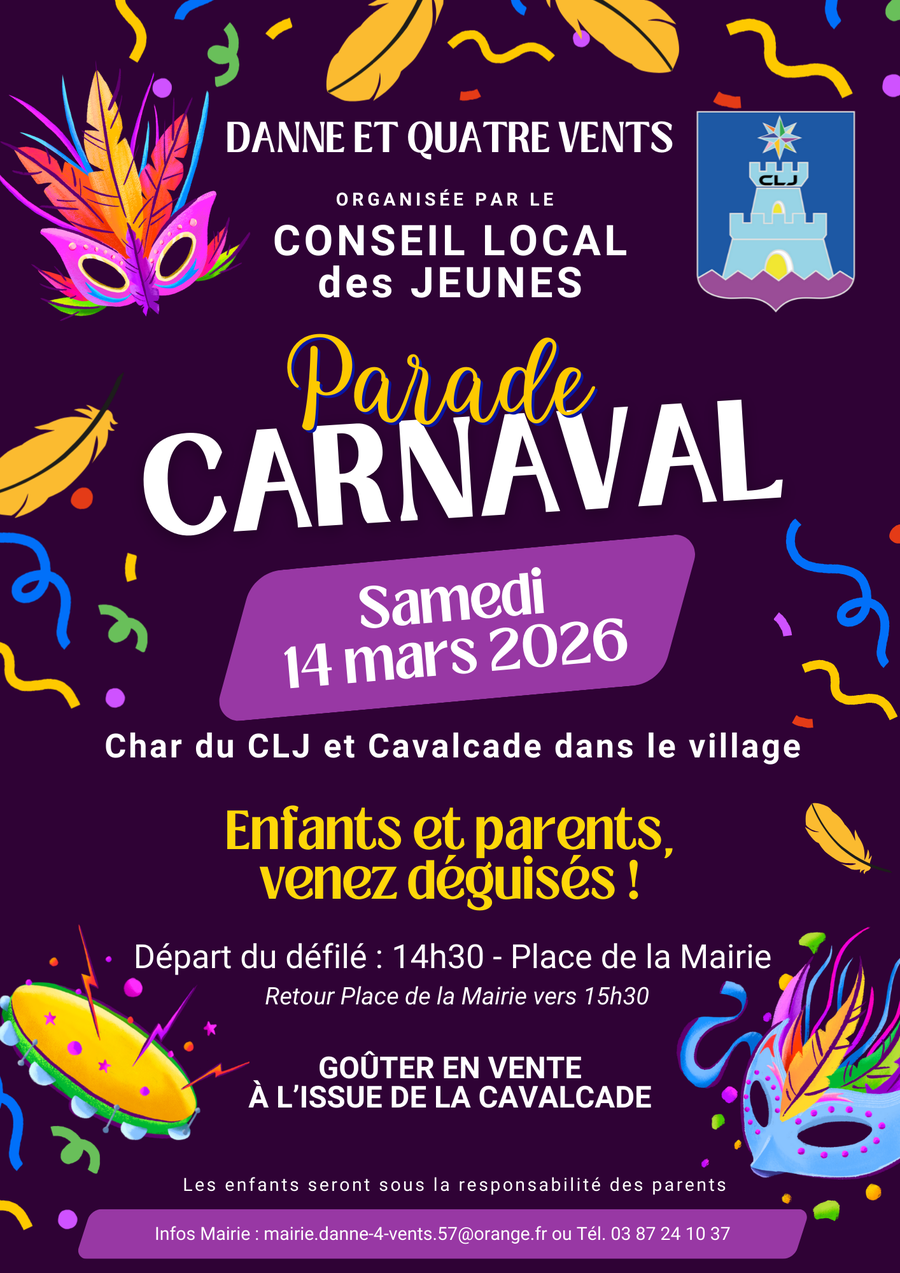 La cavalcade du carnaval du CLJ partira à 14h30 depuis la place de la mairie direction rue de l’église, rue des mirabelles, rue des saules, puis direction rue du château, rue de la fontaine et rue de la forêt pour revenir vers la rue de l’église et terminer place de la mairie vers 15h30.