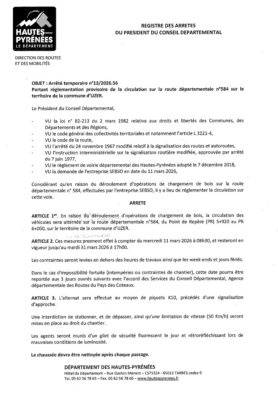 Réglementation provisoire de la circulation sur la route départementale 584 en raison d’opérations de chargement de bois