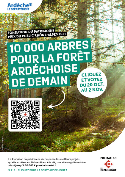 Le projet ardĂ©chois « 10 000 arbres pour la forĂȘt ardĂ©choise de demain » a Ă©tĂ© sĂ©lectionnĂ© par la Fondation du patrimoine comme candidat pour lâArdĂšche, dans le cadre du Prix du public RhĂŽne-Alpes 2025. Il est en compĂ©tition avec 7 autres projets qui reprĂ©sentent chacun leur dĂ©partement...c'est Ă©galement le seul projet de patrimoine naturel.