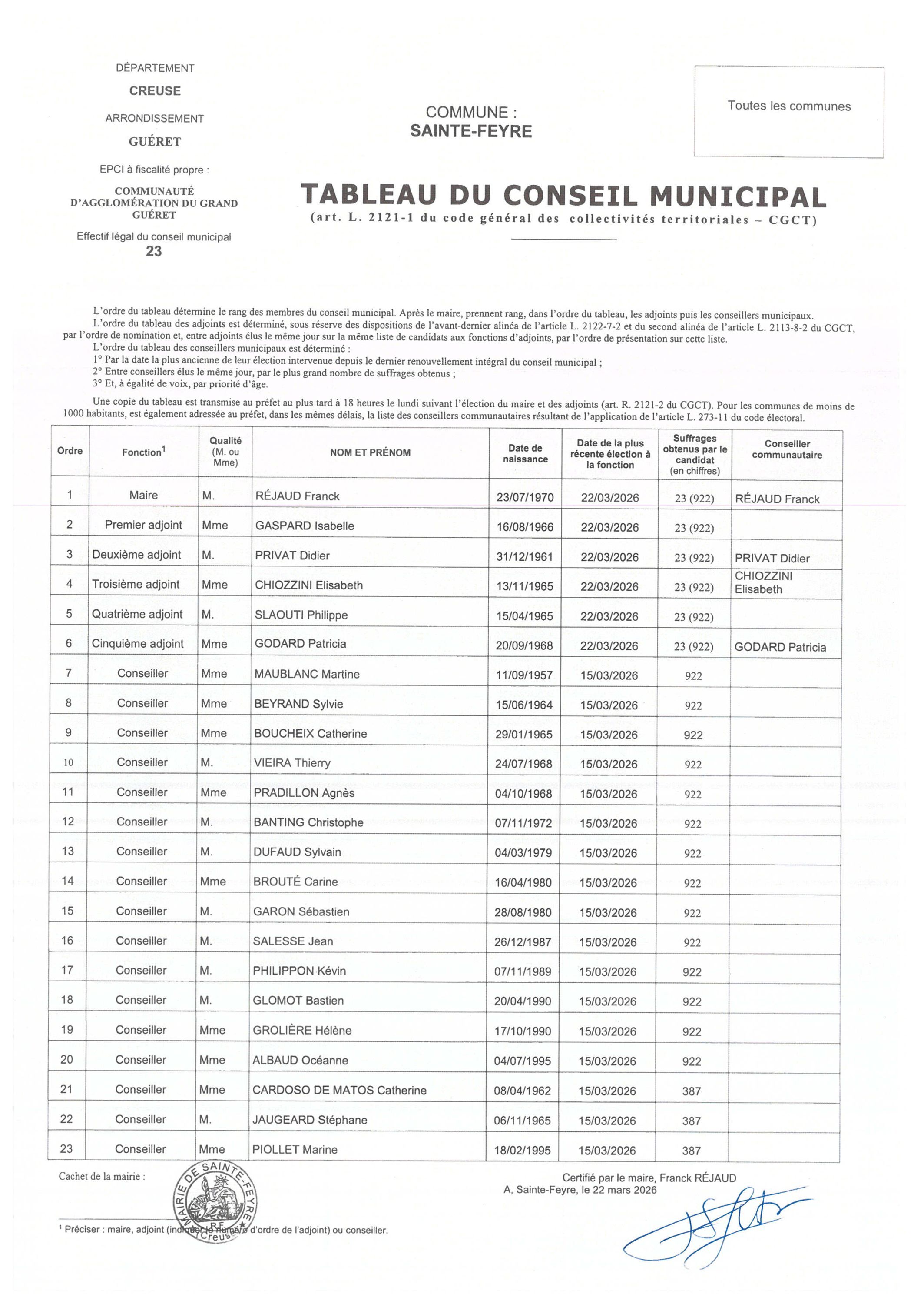 Ont été élus à l’unanimité du Conseil Franck RÉJAUD Maire,