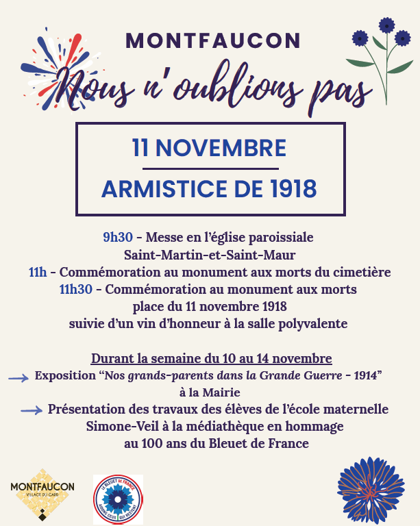 11h30 - commémoration au monument aux morts de la place du 11 novembre 1918 suivie d'un vin d'honneur à la salle polyvalente.