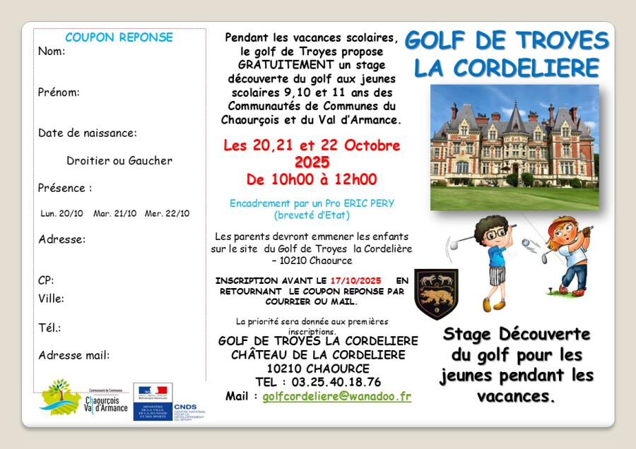 Le Golf de Troyes La Cordelière propose gratuitement un stage découverte du golf à destination des jeunes les dates sont les suivantes :