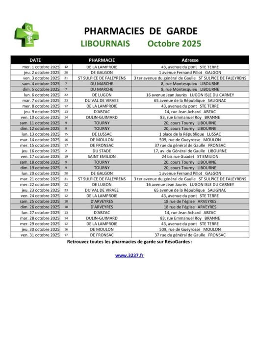 En cas de besoin en dehors des heures d’ouverture classiques, voici la liste des pharmacies de garde dans le secteur du Libournais pour le mois d'octobre 2025 ⤵️