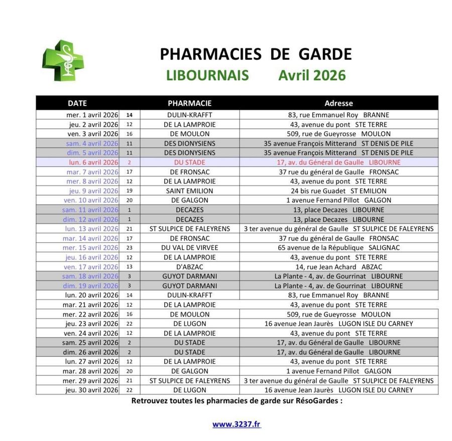 En cas de besoin en dehors des heures d’ouverture classiques, voici la liste des pharmacies de garde dans le secteur du Libournais pour le mois d'avril 2026 ⤵️