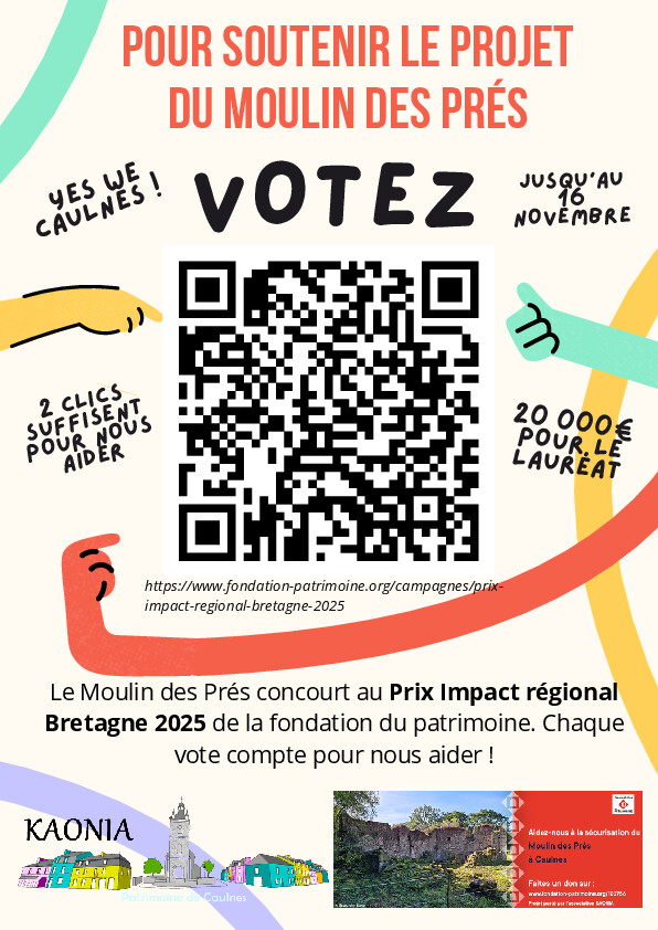 patrimoine KAONIA, vous invite à prendre connaissance et à voter pour aider à la restauration du moulin des Prés.