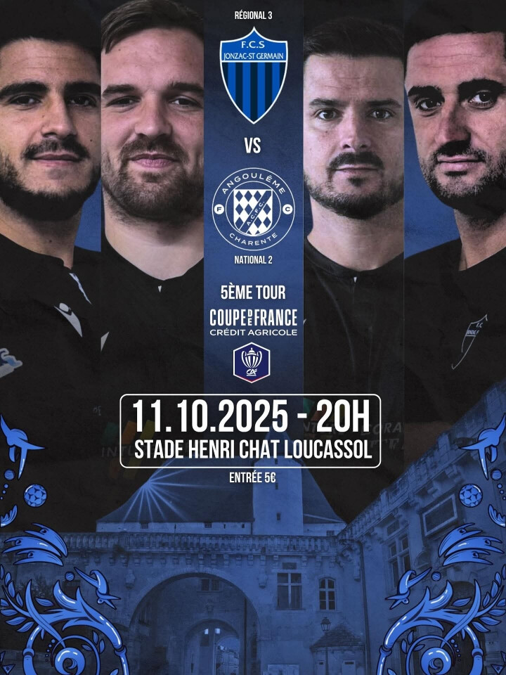 Ce samedi 11 octobre le FCS Jonzac St Germain reçoit Angoulême nationale 2 pour le compte du 5eme tour de coupe de France. Nous attendons beaucoup de supporters pour encourager Jonzac.