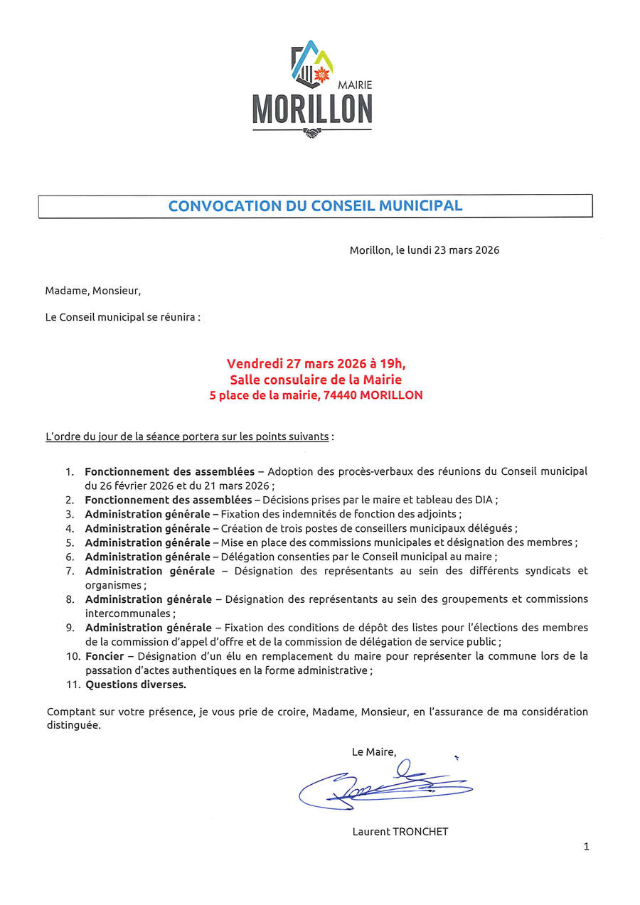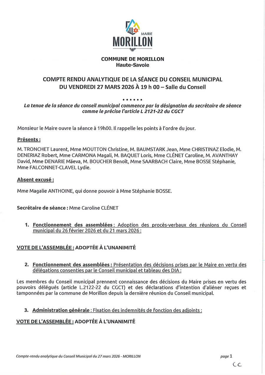 Le compte-rendu de la séance du Conseil municipal du 27 mars 2026 est disponible ci-dessous ainsi que sur le lien suivant : https://www.mairie-morillon.com/conseil-municipal-du-27-mars-2026-compte-rendu/