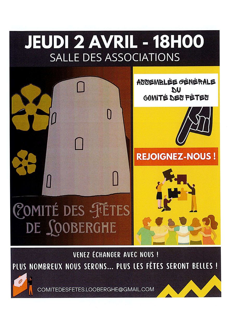 Le Comité des Fêtes de Looberghe arrive à l’échéance de son mandat. Afin d’assurer la continuité de ses actions et de préparer les animations à venir pour notre commune, une assemblée générale est organisée pour procéder au renouvellement du bureau.