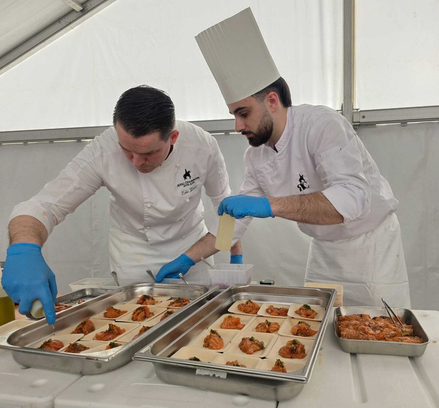 5️⃣ Dresser le saumon en chiffonnade dans l’assiette, ajouter un filet d’huile d’olive et un peu de sobacha pour le croustillant.