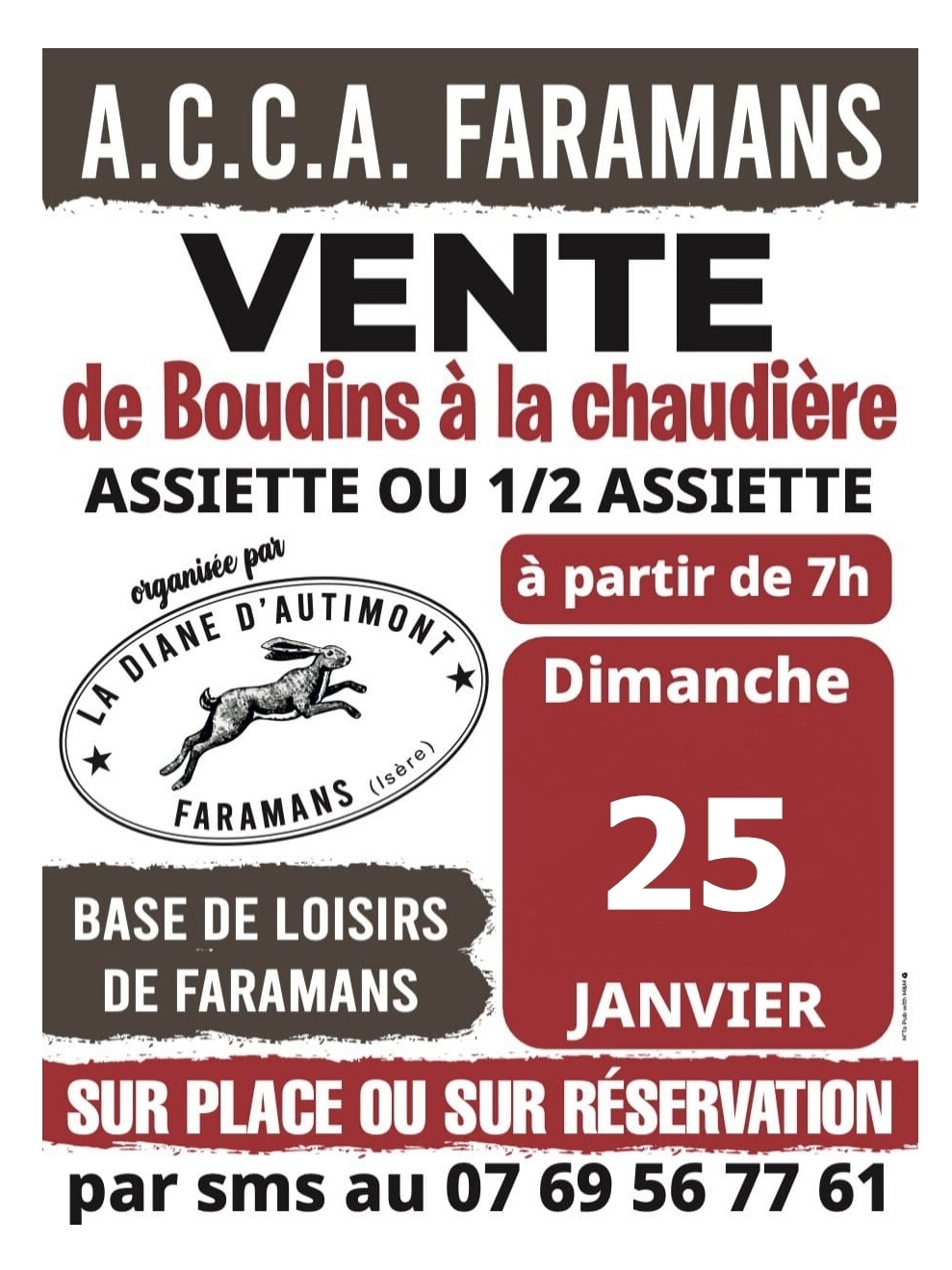 Vente de Boudins à la chaudière, le dimanche 25 janvier à partir de 07H, à la base de loisirs de FARAMANS