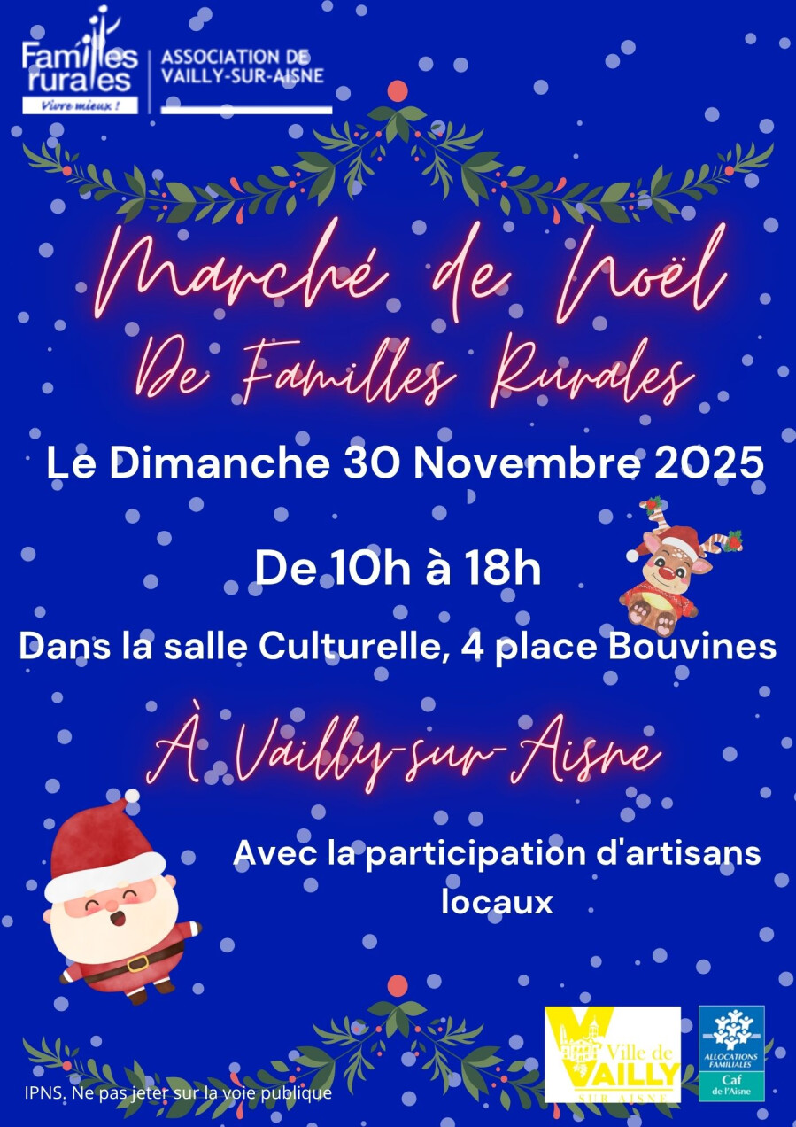 🎄 Familles Rurales Vailly vous invite à son traditionnel marché de Noël, avec la participation de nombreux artisans locaux.