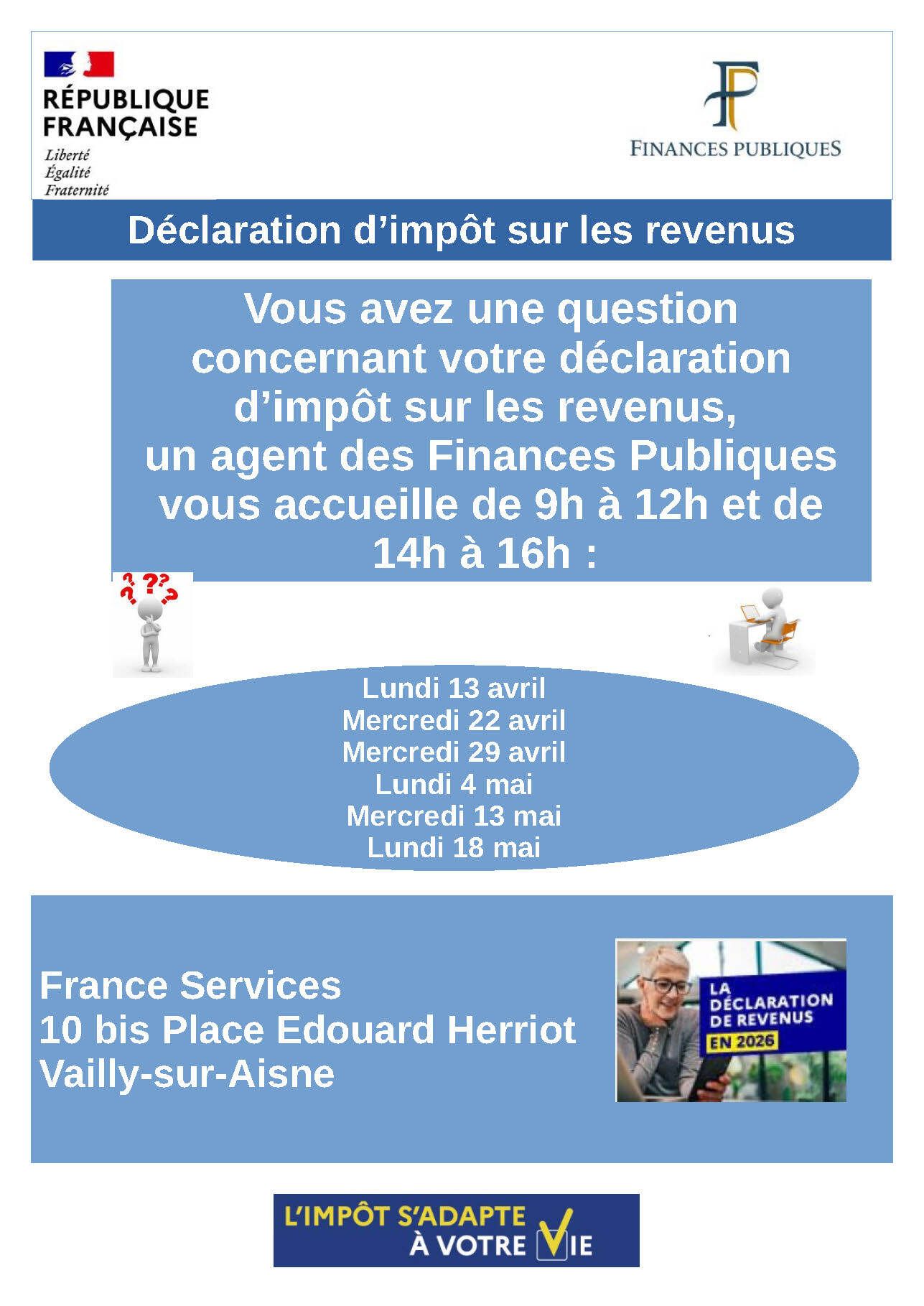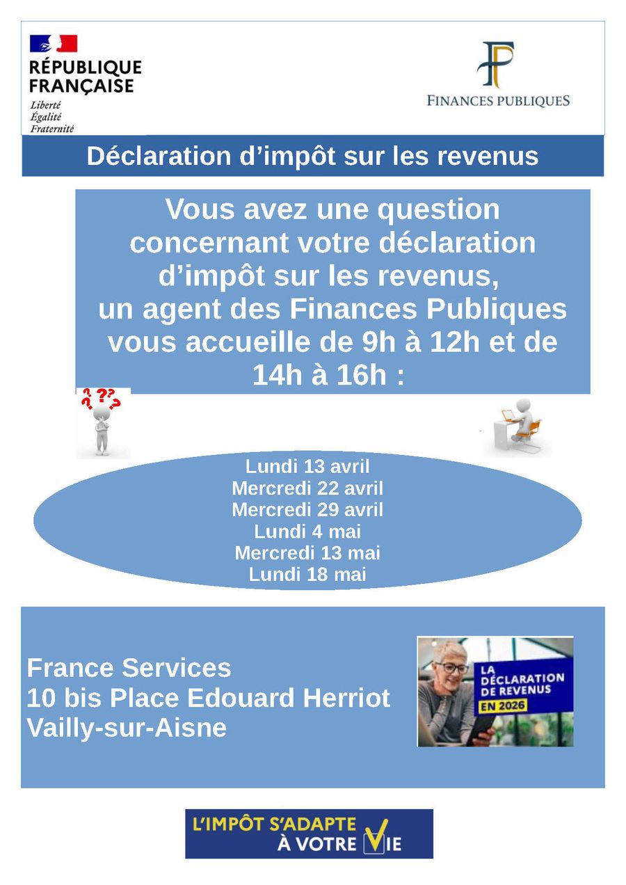 Dans le cadre de la campagne déclarative, un agent de la Direction générale des Finances publiques assurera des permanences au sein de l’espace France Services de Vailly-sur-Aisne afin d’accompagner les usagers dans leurs démarches relatives à l’impôt sur le revenu.
