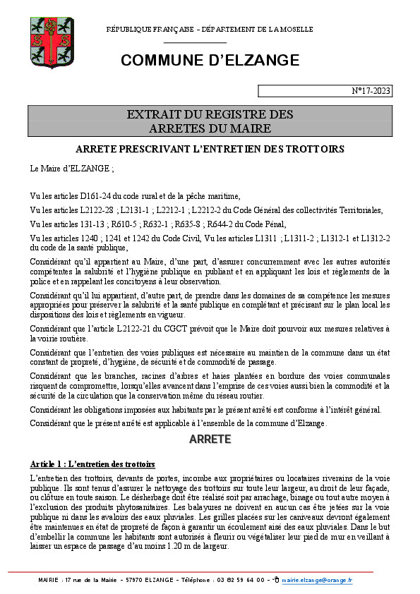 Article 2 : Par temps de neige ou de verglas, les propriétaires ou locataires sont tenus de balayer la neige au droit de leurs maisons, sur les trottoirs ou banquettes jusqu'au caniveau, en dégageant celui-ci autant que possible. En cas de verglas, ils doivent répandre du sel ou du sable devant leurs habitations.