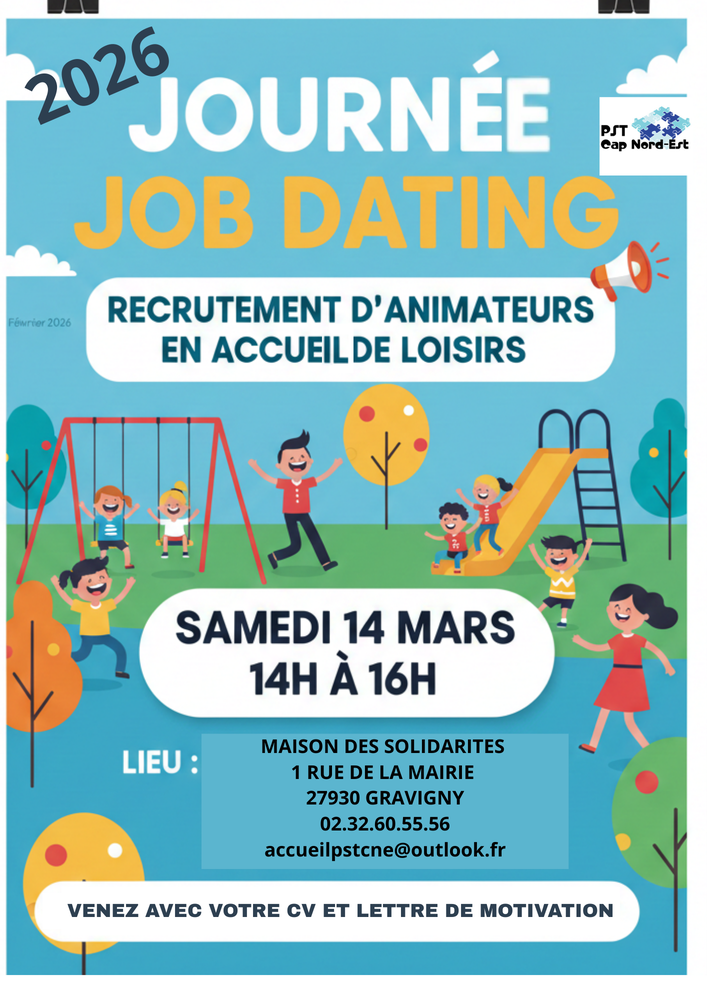 À l'approche des vacances de printemps et de la période estivale, la recherche d’animateurs qualifiés est un enjeu majeur pour notre association. C’est dans cette optique que les structures enfance et jeunesse du territoire organisent une après-midi de « Job Dating », le samedi 14 mars, de 14h à 16h.