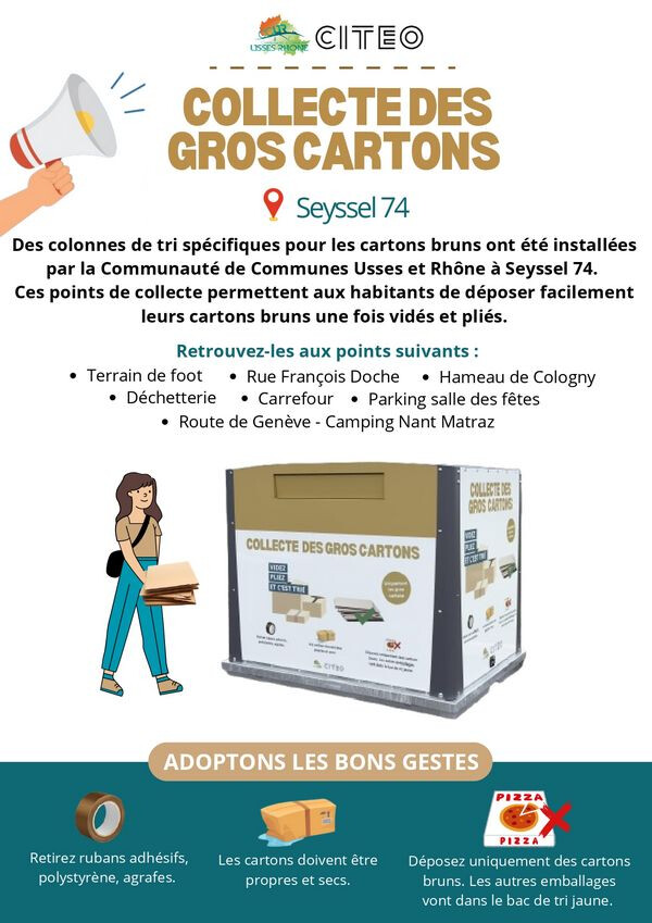 En partenariat avec Citeo, la Communauté de Communes Usses et Rhône installe des colonnes de tri spécifiques pour vos cartons bruns, près des points de tri sélectif. Plus besoin de vous déplacer en déchetterie pour vos gros cartons ! Les emplacements sont indiqués dans l'image.
