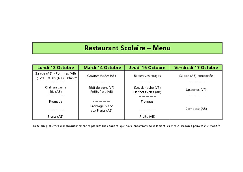 Menu du 13 au 17 octobre