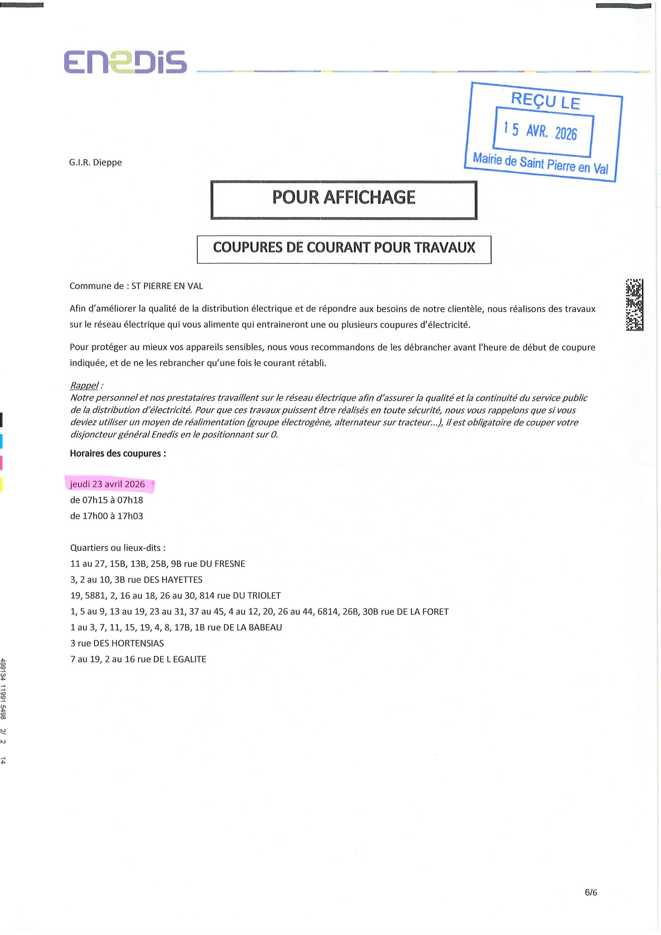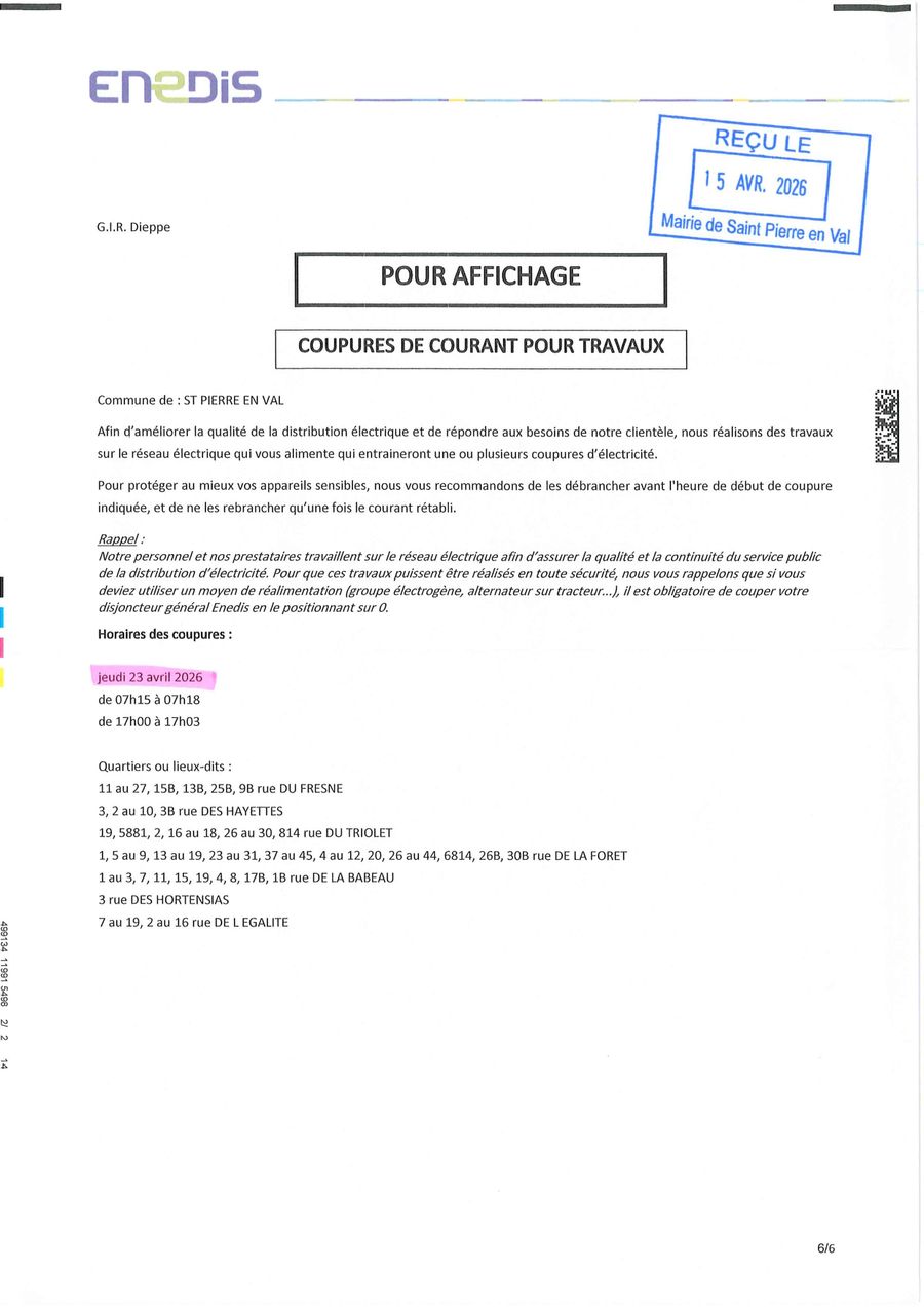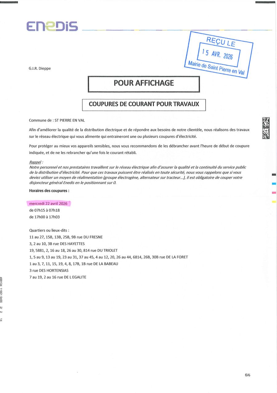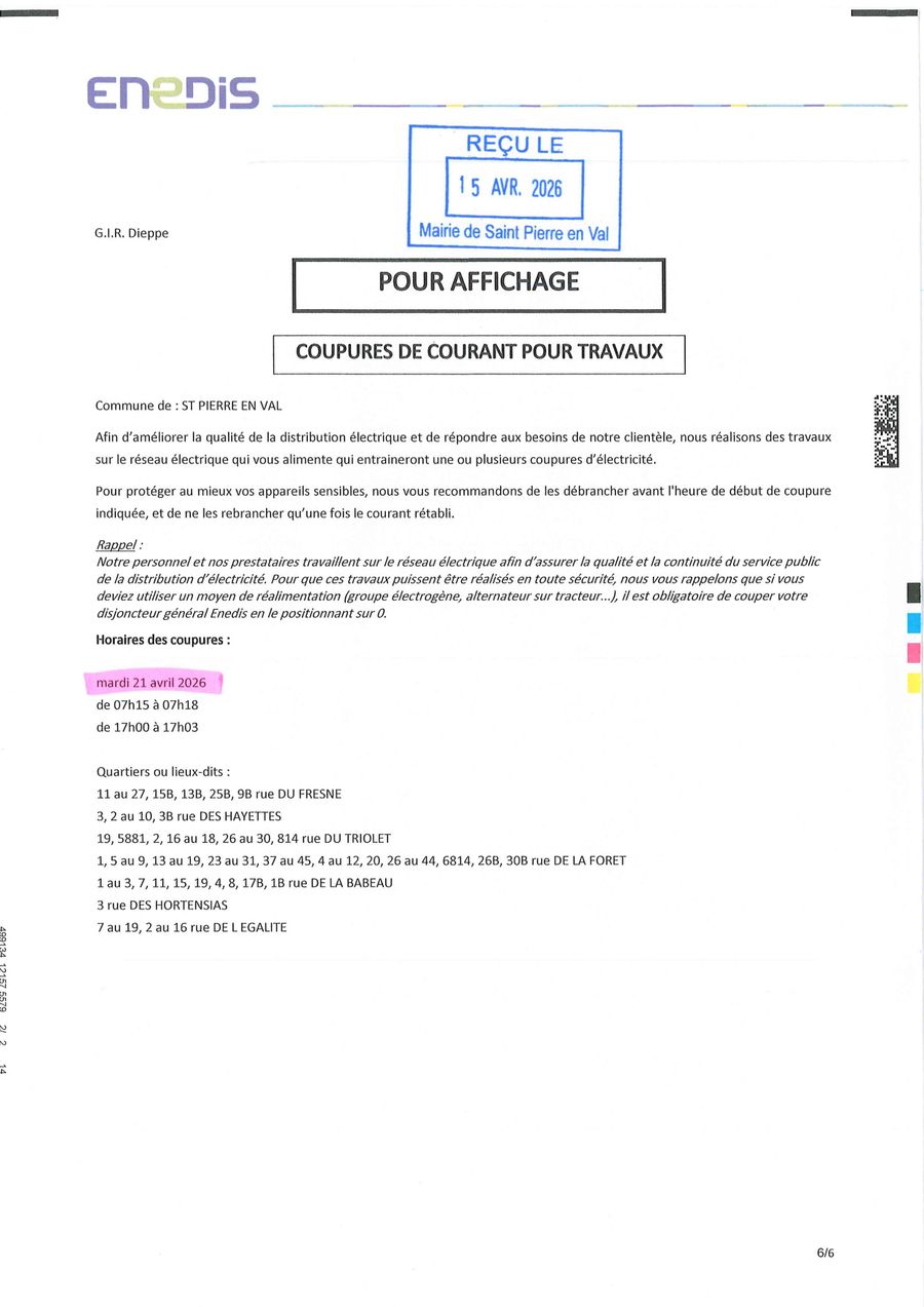 Enedis nous informe que de rapides coupures auront lieu du mardi 21 au jeudi 23 avril