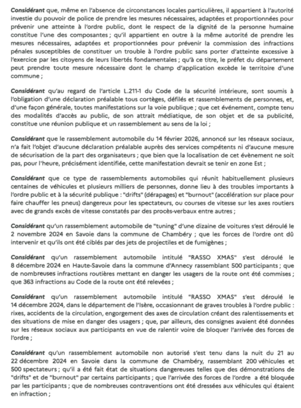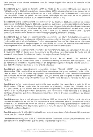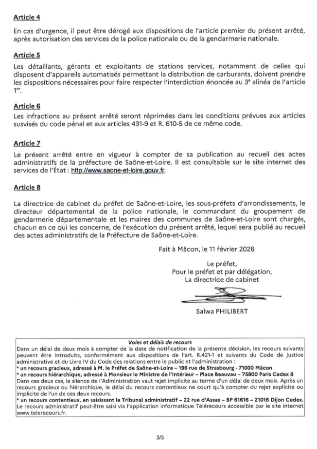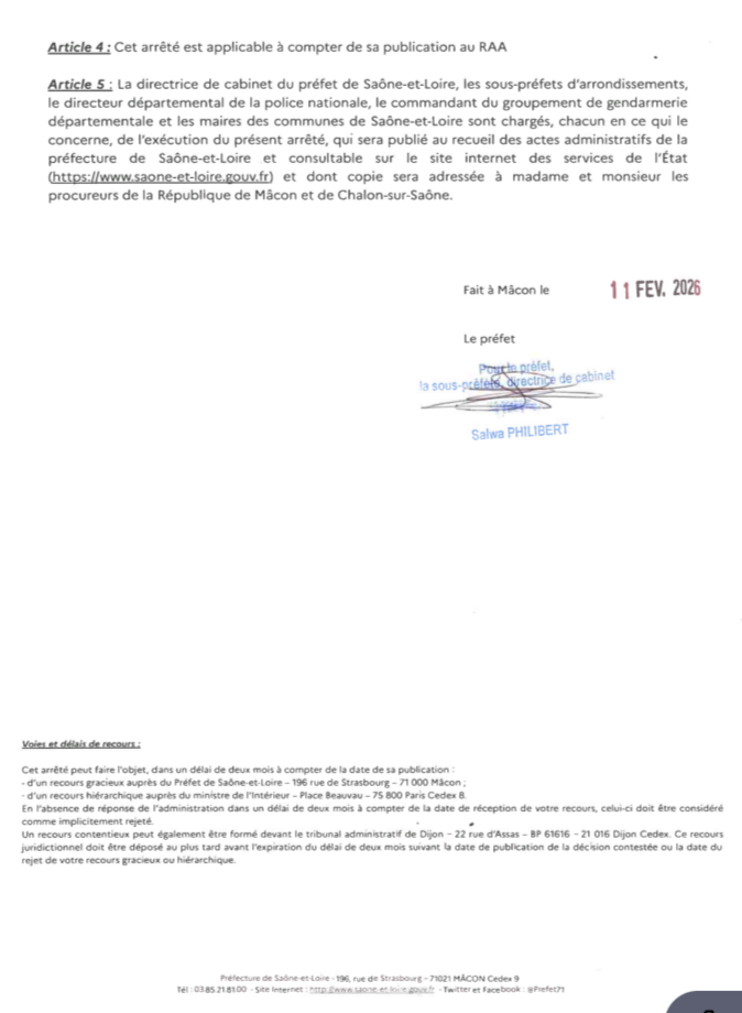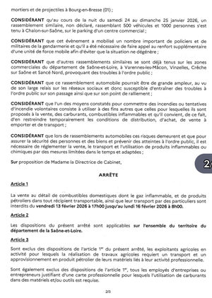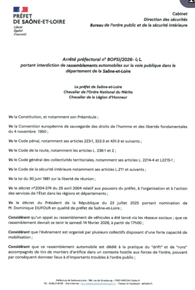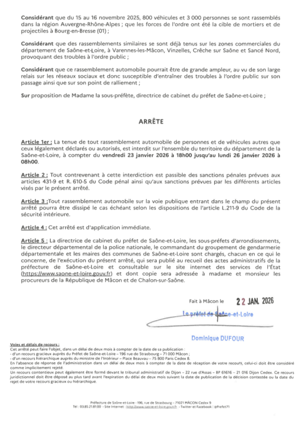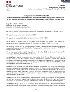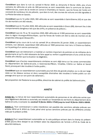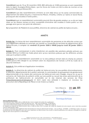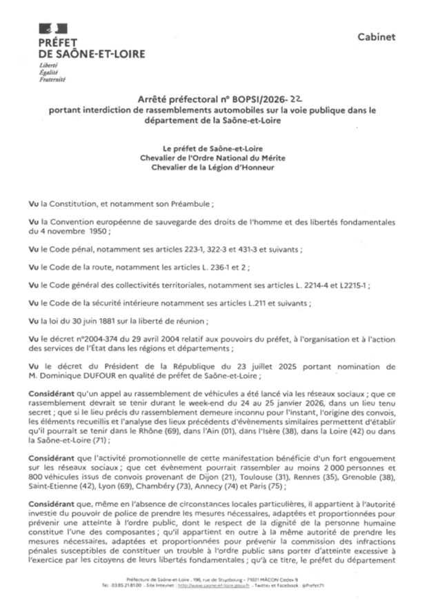 Arrêté BOPSI/2025-22 portant interdiction de rassemblements automobiles sur la voie publique dans le département de Saône-et-Loire, applicable à compter de ce jour à 18h00 jusqu'au lundi 26 janvier 2026 à 08h00. Cet arrêté a fait l'objet d'une publication au RAA spécial n° 71-2026-023 publié le 22 janvier 2026.