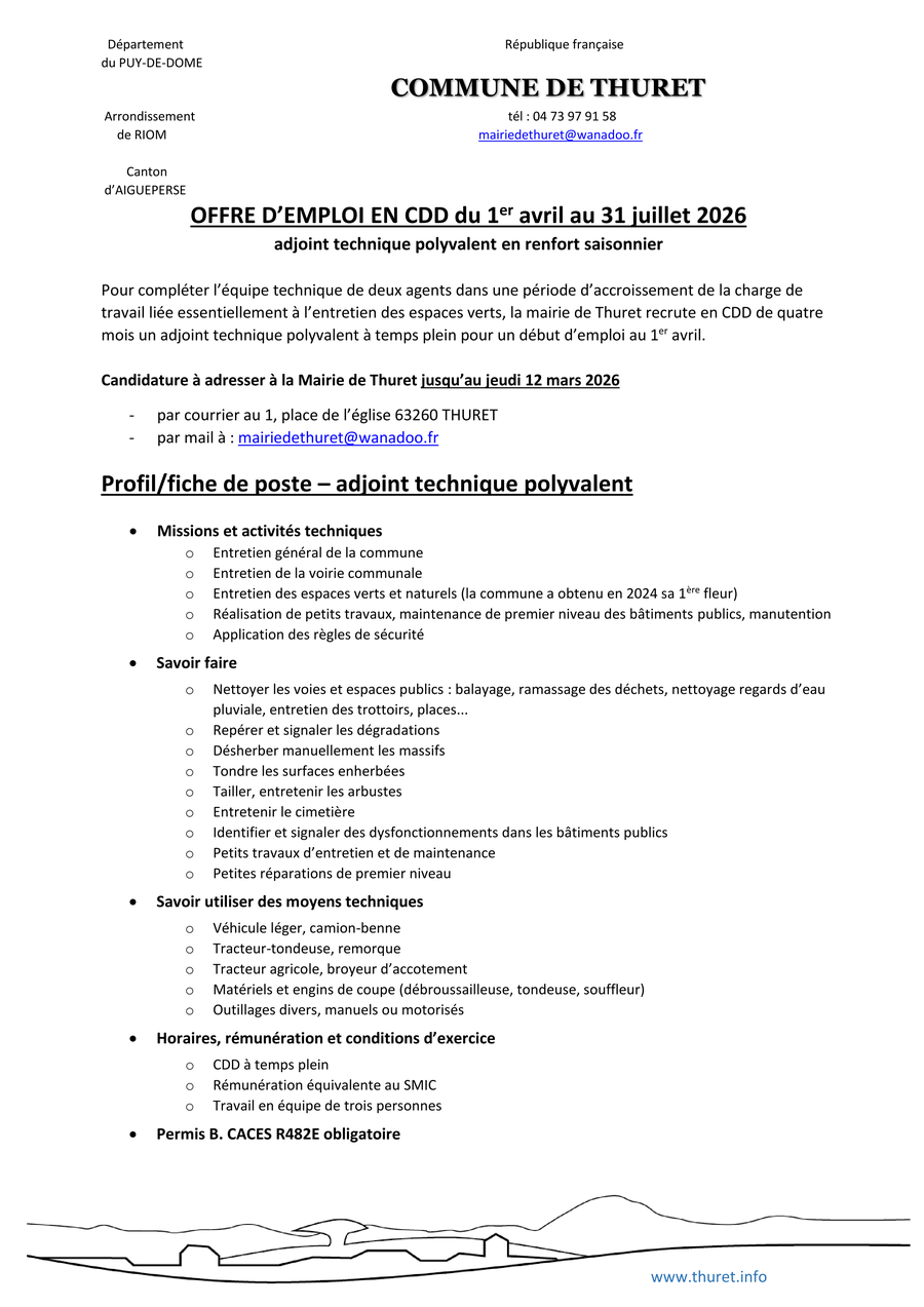 Candidature à adresser à la Mairie de Thuret jusqu’au jeudi 12 mars 2026 :